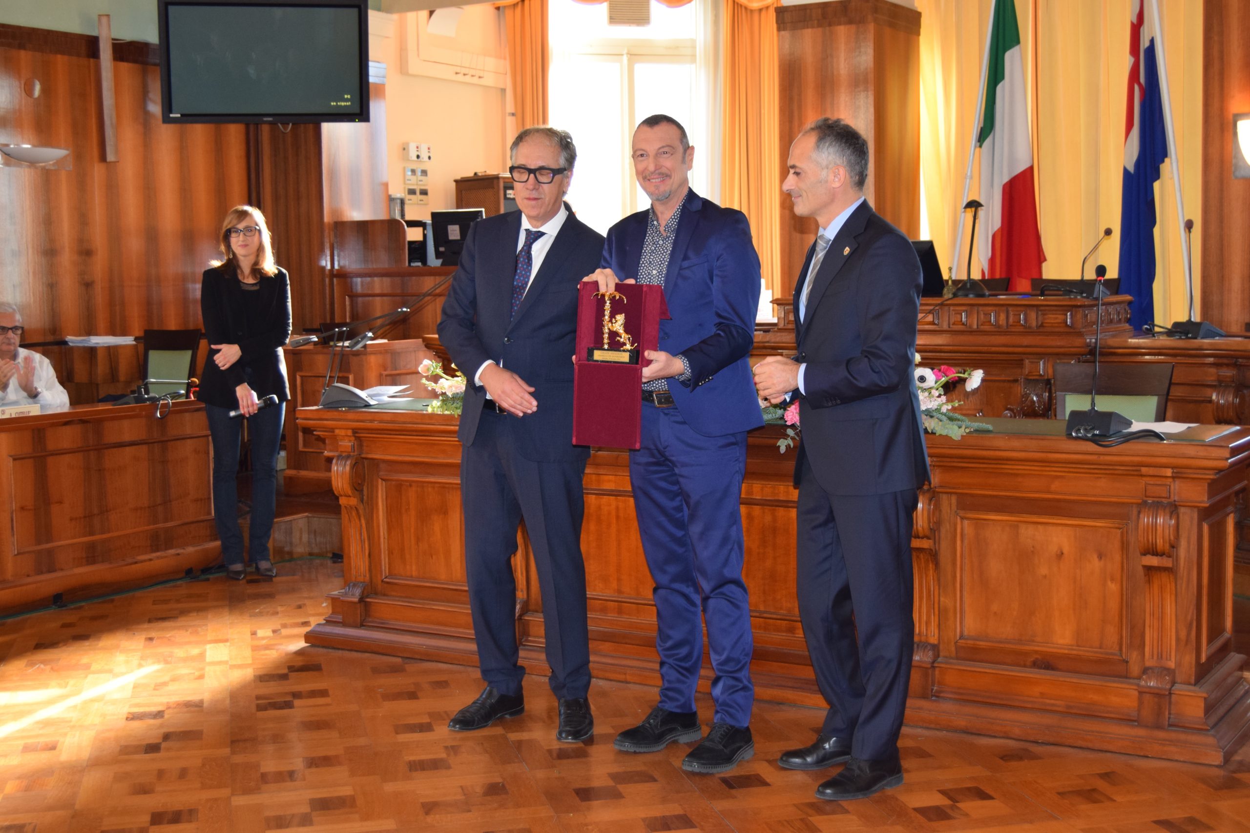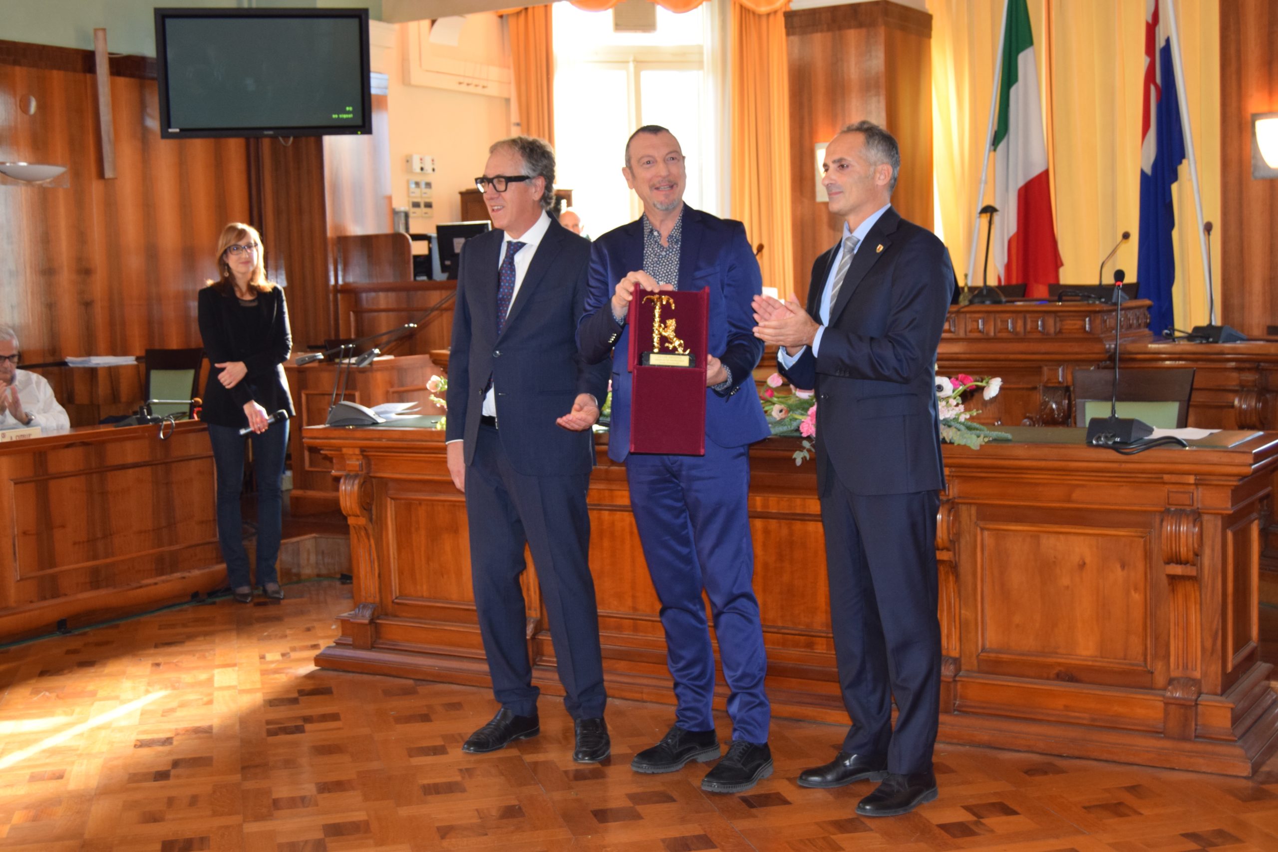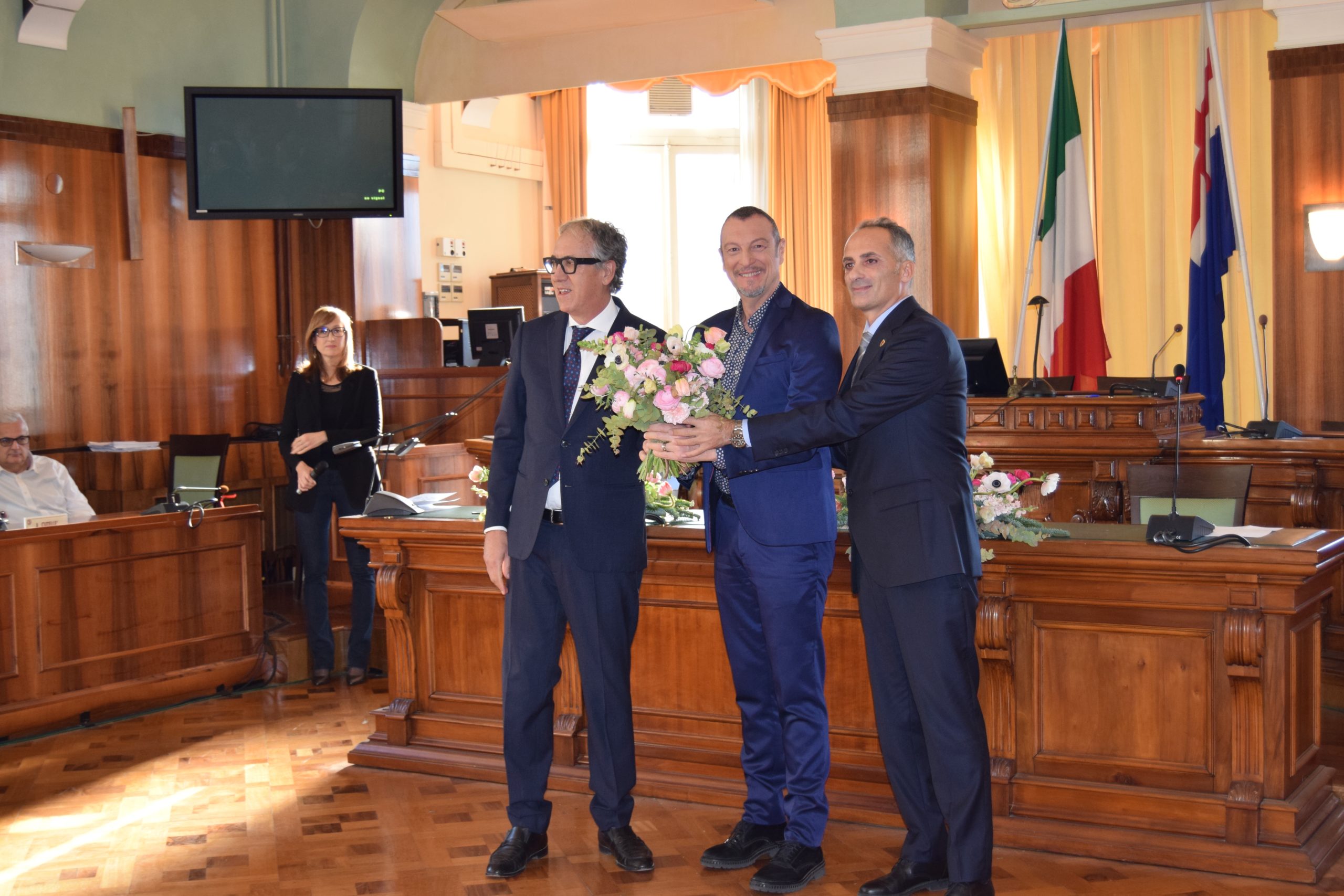 Martedì 19 dicembre 2023 nella Sala del Consiglio Comunale di Sanremo, alle ore 10:30 il Sindaco Alberto Biancheri ha consegnato ad Amadeus un importante premio “AMICO DI SANREMO” 2023, presenti alla cerimonia tutti i componenti dell’Amministrazione della Città .