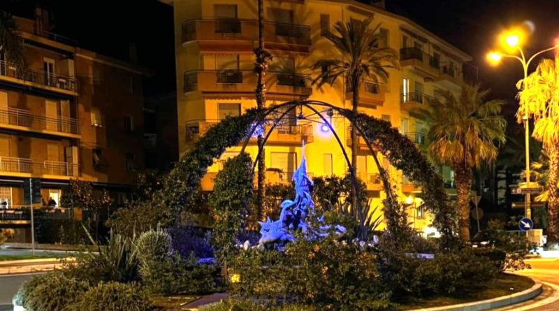 BORDIGHERA – FONTANA DELLE SIRENE ILLUMINATA DI VIOLA