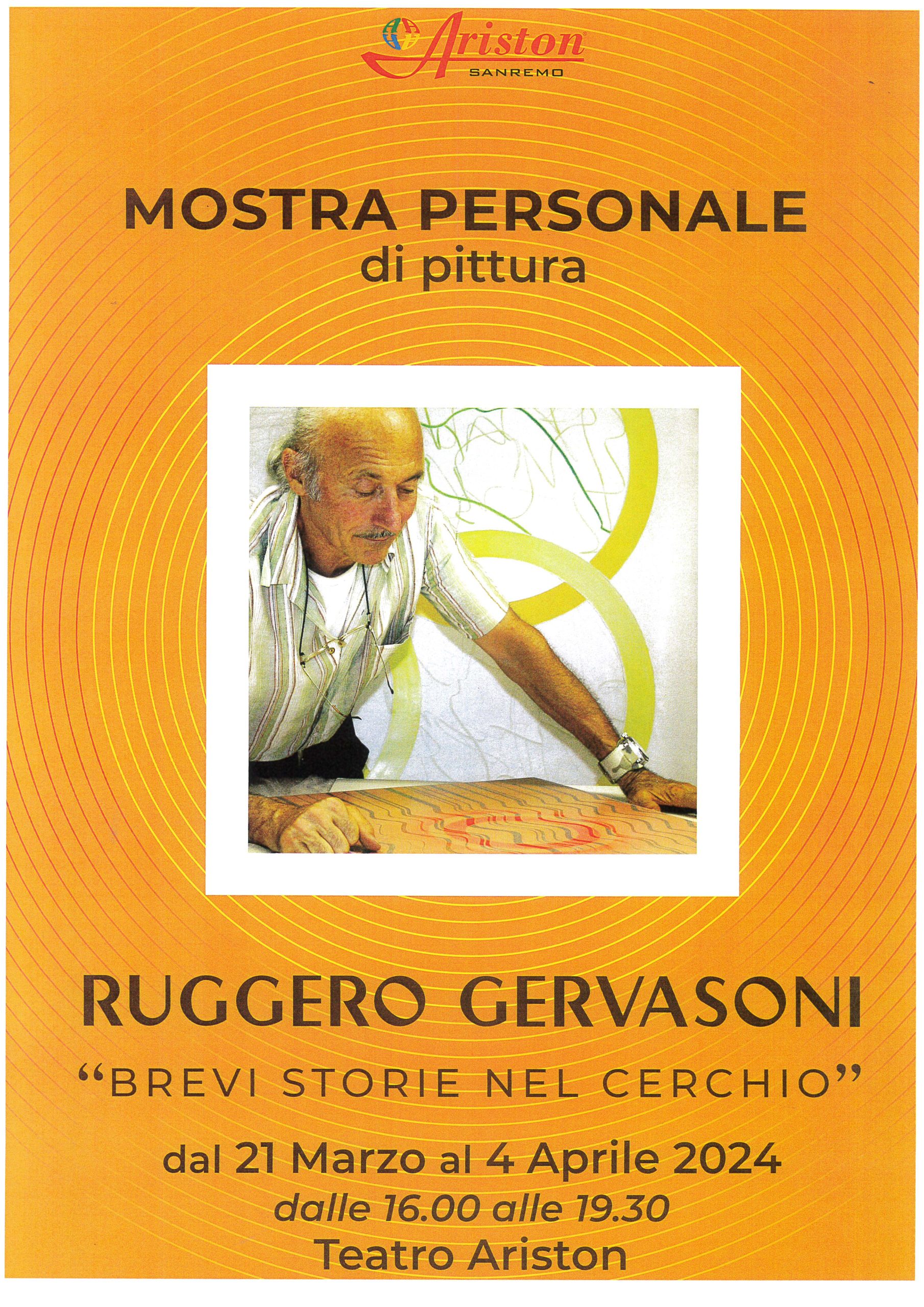 Da giovedì 21 marzo a giovedì 4 aprile 2024, con orario dalle 16.00 alle 19.30, il teatro Ariston, nella sala incontri-soppalco bar, ospiterà la mostra personale di pittura “Brevi storie nel cerchio” di Ruggero Gervasoni.