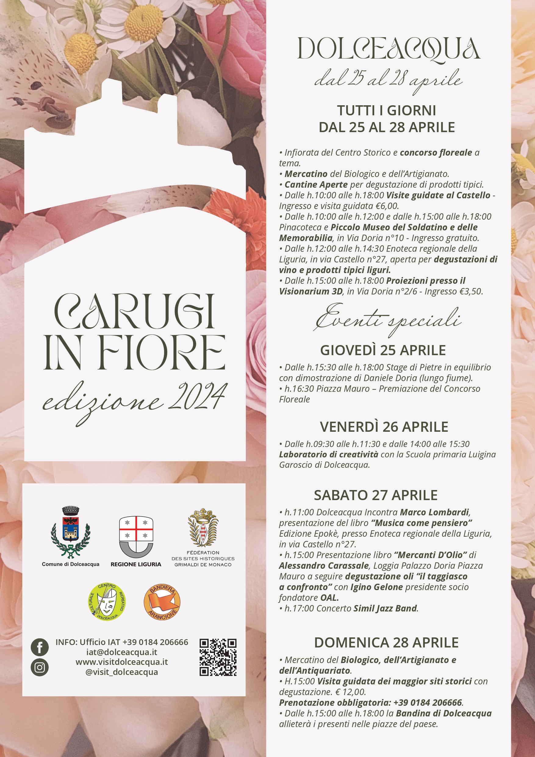 A Dolceacqua torna l’attesa festa “Carugi in Fiore”, che ogni anno annuncia l’arrivo della primavera e che si terrà in tutto il paese da giovedì 25, Festa della Liberazione, a domenica 28 aprile.