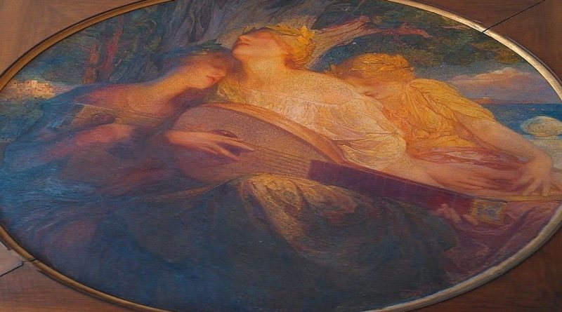 Durante il suo soggiorno a Bordighera, Van Biesbroeck riceve dalle Nobili Dame di compagnia della Regina Margherita l’incarico di eseguire alcuni dipinti di pregio raffiguranti le Muse della Musica da regalare alla Sovrana. Il pittore, terminati i dipinti e presentato il conto alle Nobili Dame, alcune delle quali erano nel frattempo venute a mancare, apprende che costoro non sono nelle condizioni di saldare il conto. Le opere rimangono così invendute sino al 1923, quando vengono messe all’asta a Bordighera. Il lotto di dipinti Tre muse con mandola, Le chapeau emplumé e Maternità con bimbo viene acquistato da Giuseppina Saladini di Rovetino e dal marito, il dottor Gianni Cristel, per decorare il salone della propria dimora in corso Garibaldi a Sanremo. I tre dipinti, secondo il desiderio espresso dai coniugi Cristel Saladini di Rovetino, in seguito alla loro morte e a quella delle loro figlie, Evelina e Giuliana, sono stati donati al Museo Civico di Sanremo e sono ora esposti in maniera permanente in una delle sale di Palazzo Nota, grazie al nipote Mariano Saladini di Rovetino.