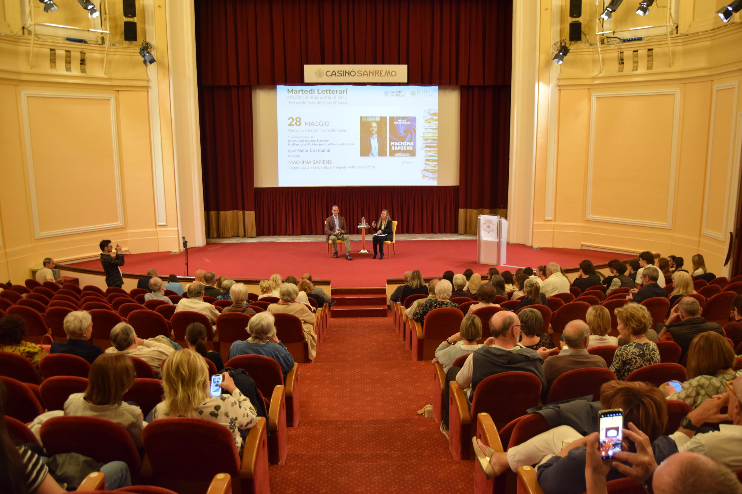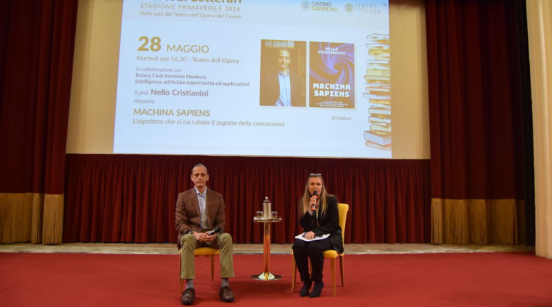 Martedì 28 maggio 2024 nel teatro dell’Opera del Casinò di Sanremo, nell’ambito dei Martedì Letterari, il prof. Nello Cristianini, docente universitario a livello internazionale, ha presentato il suo ultimo saggio “Machina sapiens. L’algoritmo che ci ha rubato il segreto della conoscenza.” (Il Mulino).
