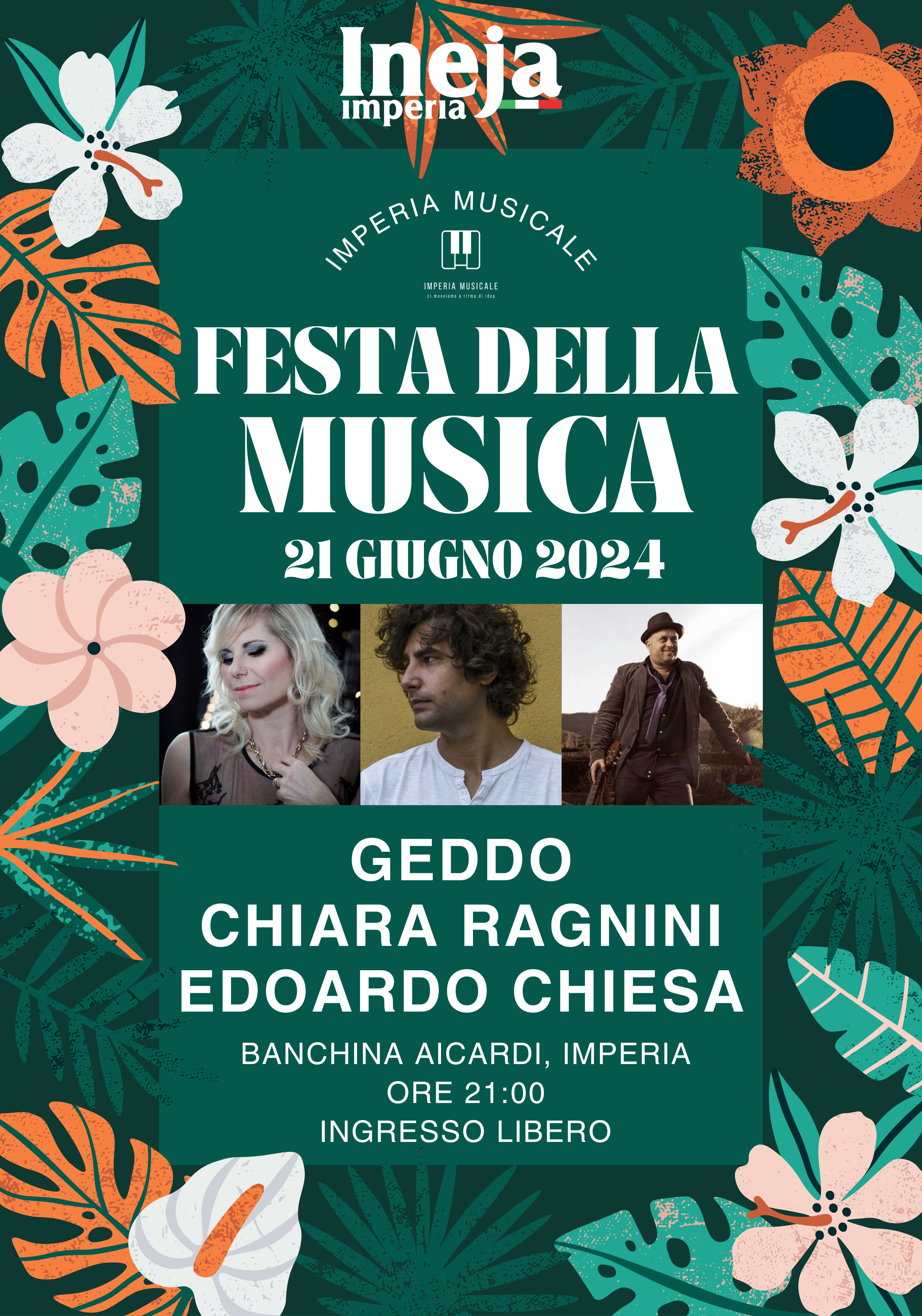 In occasione di Ineja 2024 e dei Festeggiamenti di San Giovanni, l’Associazione Culturale Imperia Musicale presenta la sua Festa della Musica venerdì 21 giugno a partire dalle ore 21 circa, proponendo sul palco tre cantautori liguri apprezzatissimi anche a livello nazionale: la pluripremiata cantautrice Chiara Ragnini, l’ingauno Geddo ed Edoardo Chiesa, che condivideranno il palco accompagnandosi con le loro chitarre e voci per far ascoltare al pubblico imperiese alcuni inediti attingendo, inoltre, al repertorio della canzone d’autore ligure.
