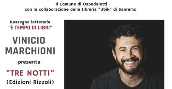 E’ tempo di libri – Un altro nome famoso a Ospedaletti per il secondo appuntamento della rassegna letteraria ‘E’ tempo di libri’. Dopo il grande successo dello scorso 30 giugno con il giornalista Sigfrido Ranucci, giovedì 18 luglio, alle ore 21,30 l’ospite designato sarà l’attore Vinicio Marchioni che presenterà il suo primo libro dal titolo “Tre notti” (ed.Rizzoli).
