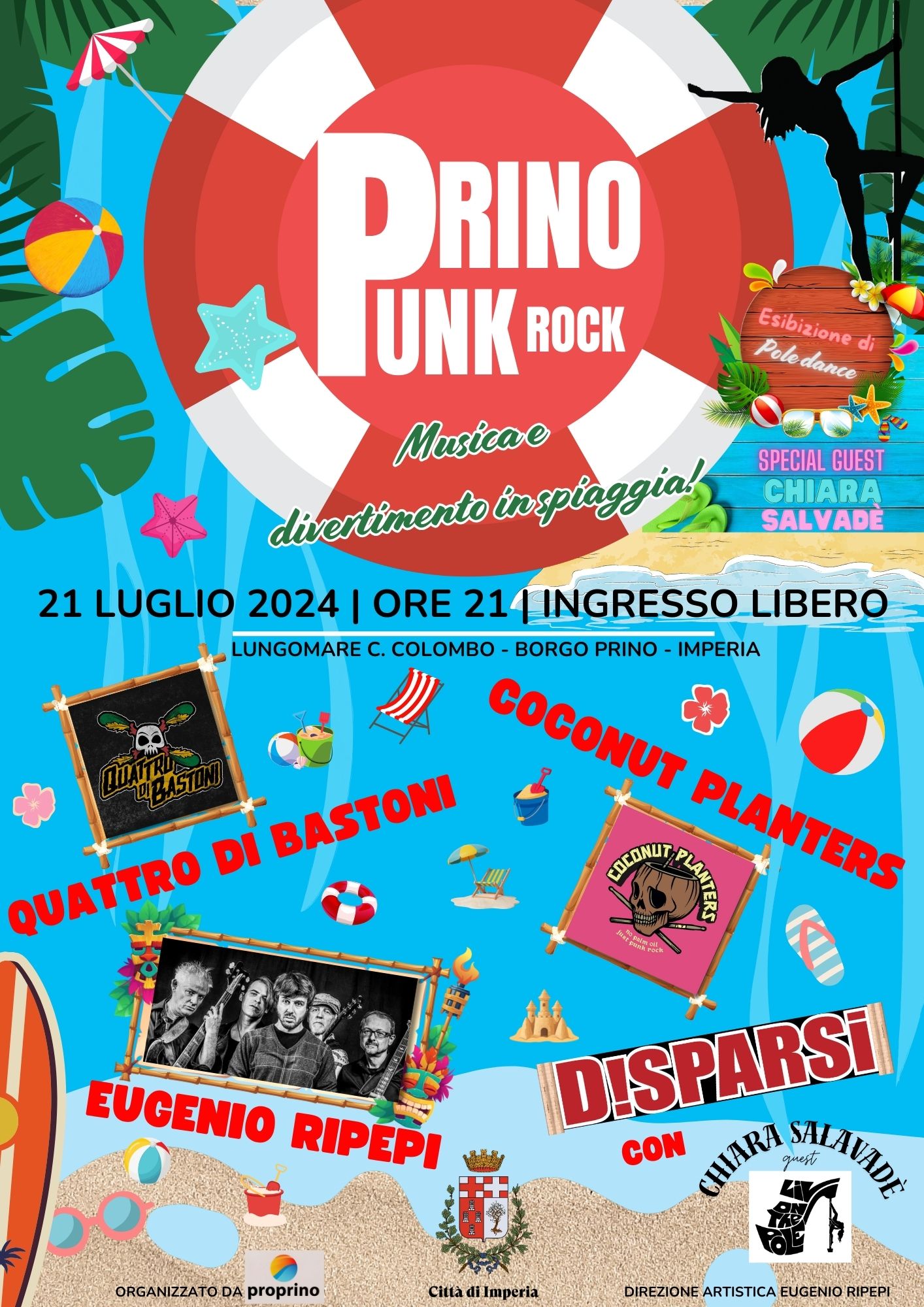 L’Associazione Pro Prino, nell’ambito delle manifestazioni estive promosse dal Comune di Imperia, con la Direzione Artistica di Eugenio Ripepi, domenica 21 Luglio all 21 sul Lungomare Colombo nella spiaggia di Borgo Prino a Imperia, presenta PRINO PUNK-ROCK. Una serata di musica e divertimento in spiaggia, con gruppi musicali e l’animazione di splendide ragazze atlete di pole dance. Ingresso libero.