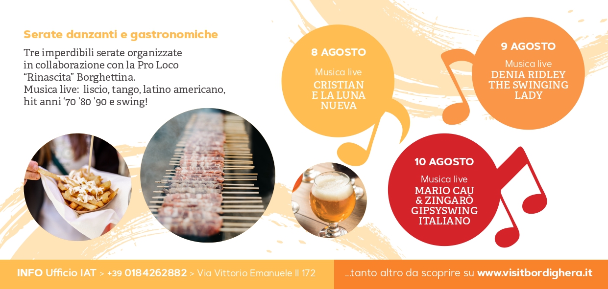 La musica, live ogni sera, sarà quella più amata con liscio, tango, latino americano, hit anni ’70, ’80 ’90 e swing. Giovedì 9 agosto saliranno sul palco Cristian e la luna nueva, “party band ligure” dai ritmi più conosciuti e trascinanti, mentre venerdì 9 agosto i Giardini vestiranno lo stile dinamico ed elegante di Denia Ridley the swinging lady. Sabato 10 agosto il ritorno a Bordighera di Mario Cau e Zingarò, con il loro inimitabile e coinvolgente gispy swing italiano.
