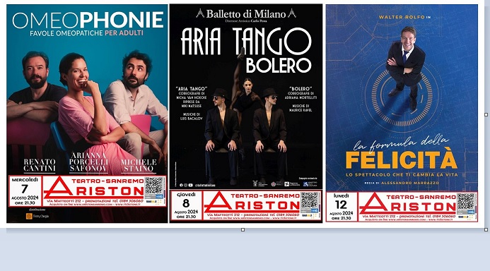TEATRO ARISTON SANREMO – CALENDARIO SPETTACOLI DAL 7 AL 12 AGOSTO 2024