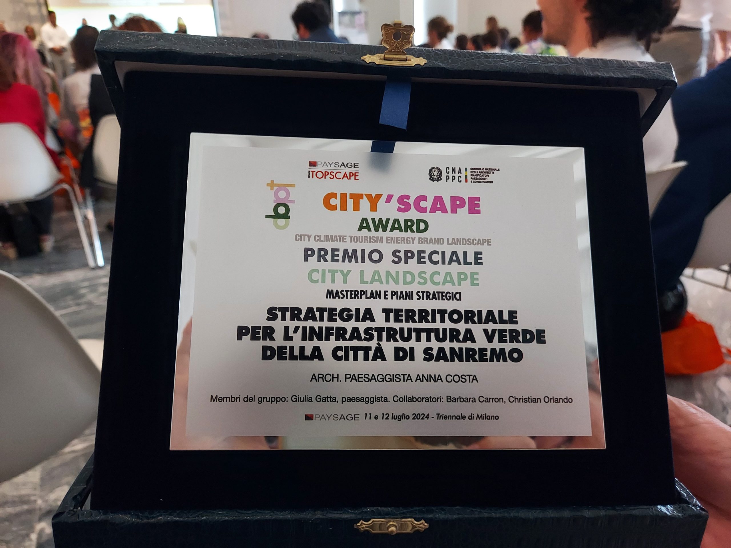 Il progetto Sanremo Verde, voluto dall’amministrazione precedente nell’ambito della progettazione PR LIGURIA FERS 2021-2027, e realizzato dall’arch. Anna Costa con la collaborazione dell’arch. paes. Giulia Gatta, e del Servizio Manutenzione Immobili e Progettazione del Comune di Sanremo, nelle persone dell’arch. Giulia Barone e dell’arch. paes. Alessandra Pellegrino, ha ottenuto il premio speciale City’scape Award denominato “Masterplan e piani strategici” nella “Categoria A0 – City Landscape: Forestazione urbana per il cambiamento climatico e progetti di resilienza al cambiamento climatico”.