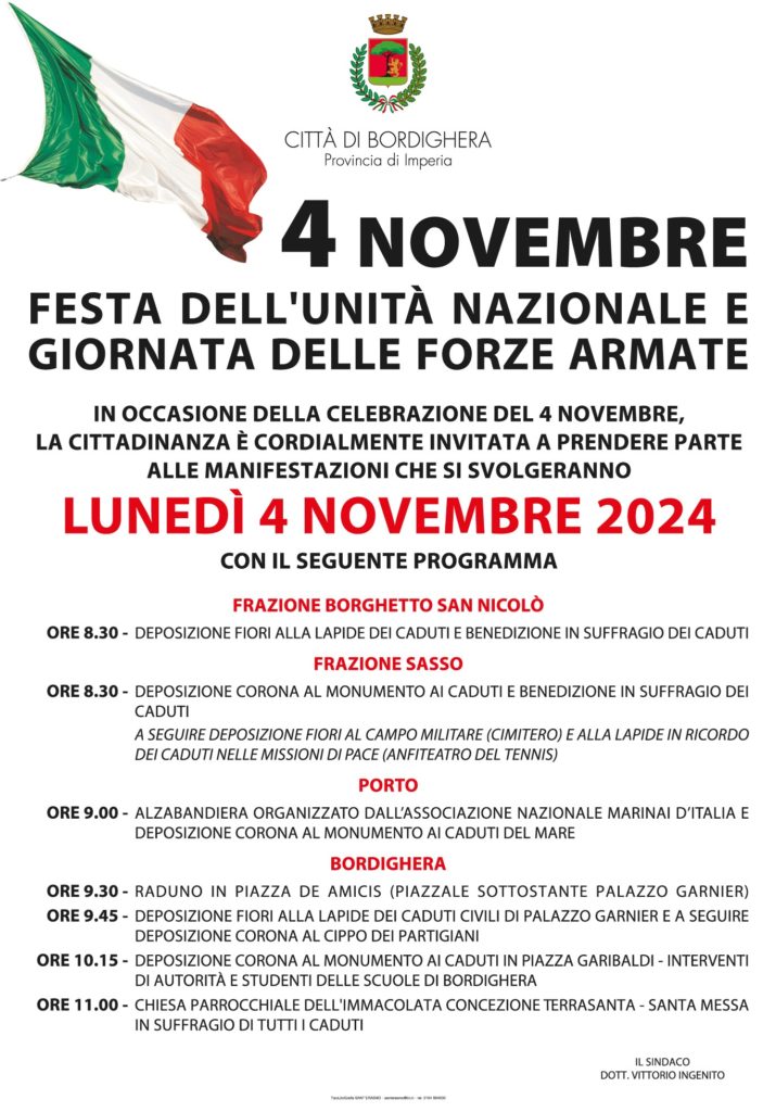 Il Comune di Bordighera rende noto il programma delle celebrazioni in occasione del 4 Novembre, Festa dell’Unità Nazionale e Giornata delle Forze Armate.
