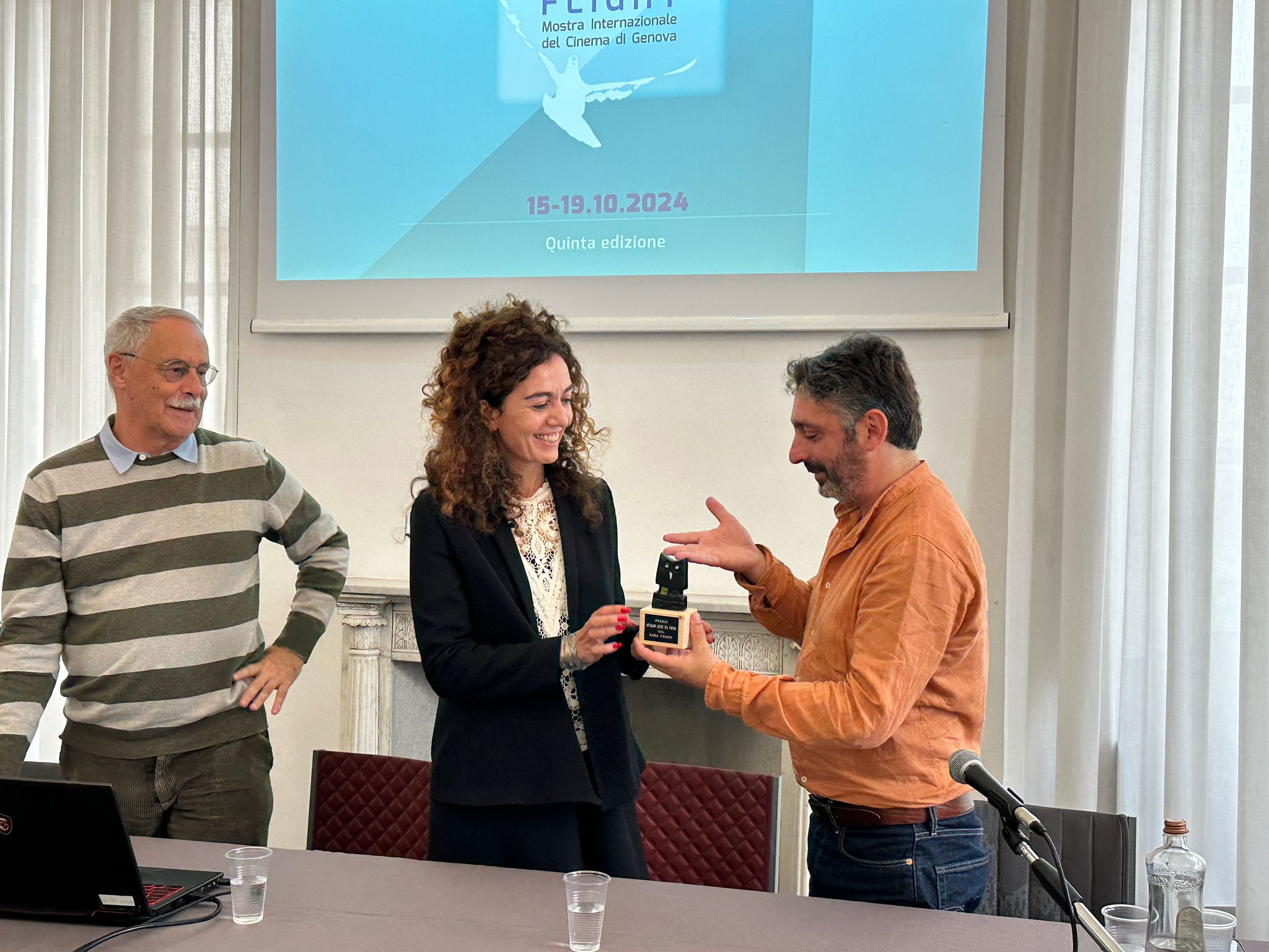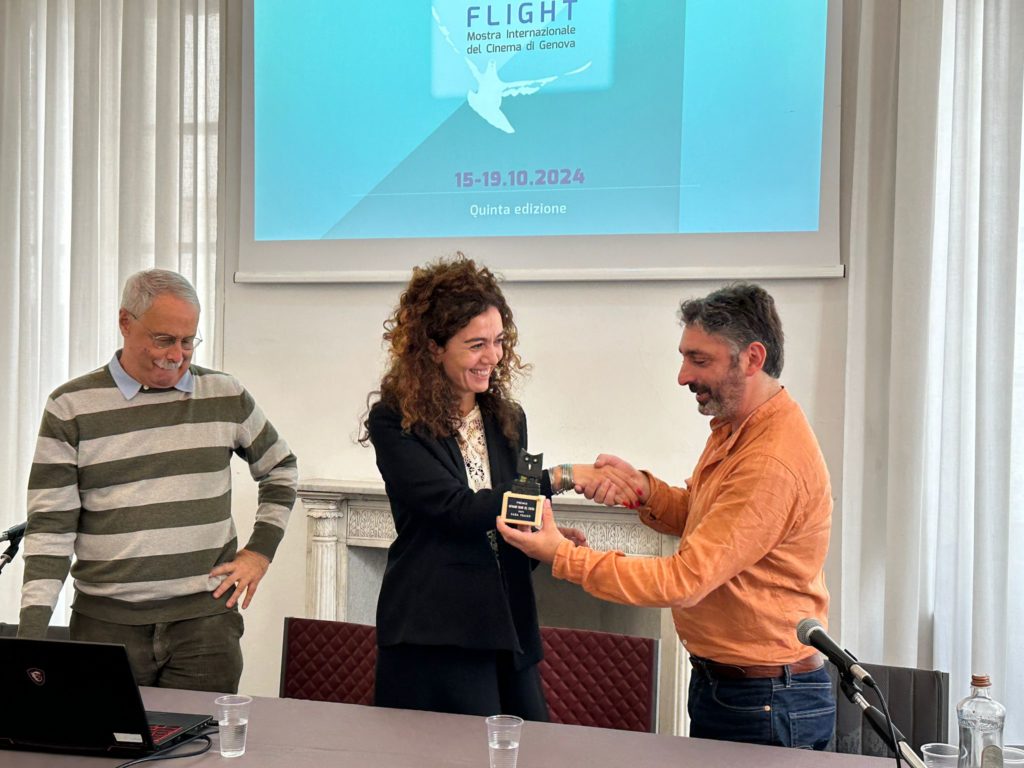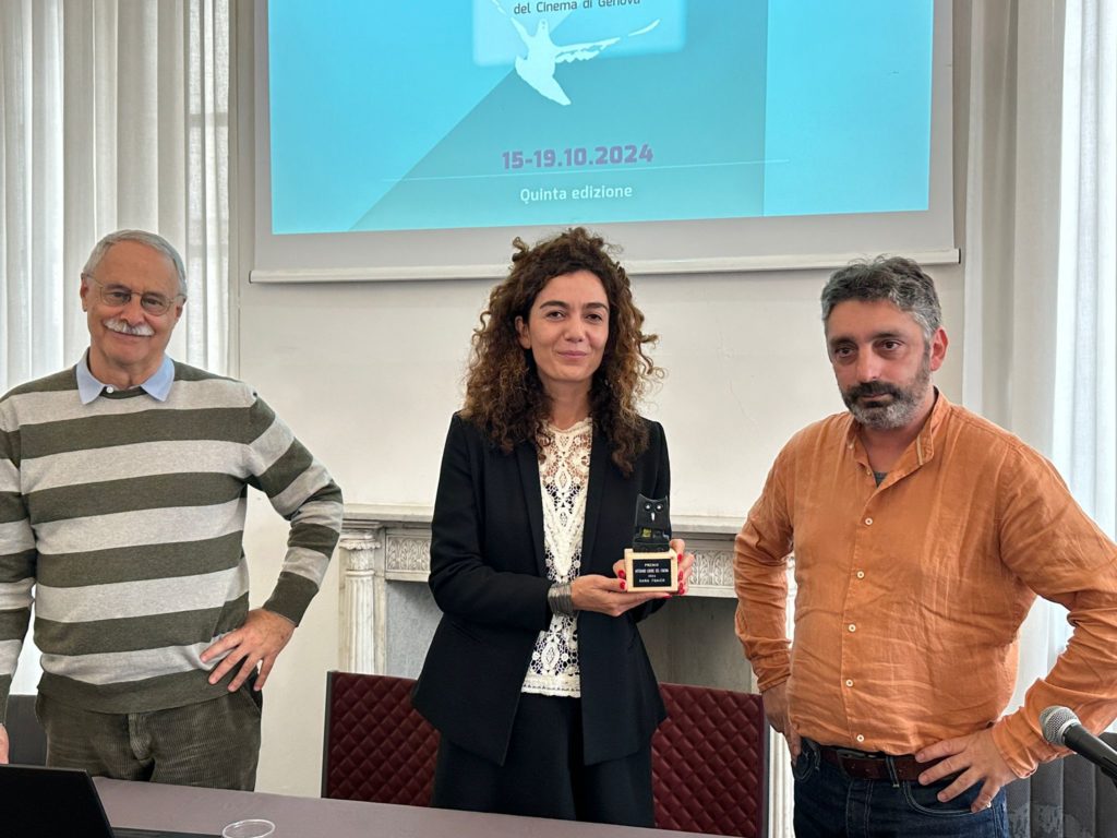 La regista e montatrice Sara Fgaier è stata premiata ieri a Palazzo Ducale, nell’ambito di FLlGHT- Mostra Internazionale del Cinema di Genova, dal portavoce di Cna Cinema e Audiovisivo Liguria Alfonso Cioce e da Andrea Rocco, organizzatore della rassegna.
