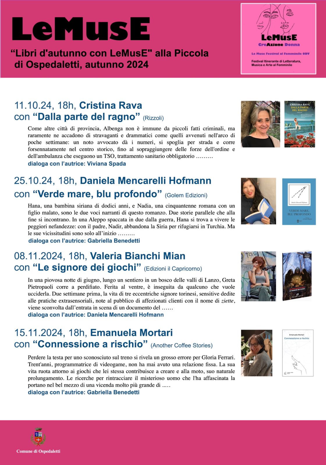 Rassegna letteraria – L’organizzazione di Volontariato Le MusE prosegue il suo percorso culturale con la rassegna letteraria “Libri d’Autunno con Le MusE” che si terrà dall’11 ottobre al 15 novembre, alle ore 18.00, presso ‘La Piccola’ (ex scalo merci) di Ospedaletti. Come detto, si comincia l’11 ottobre con Cristina Rava che presenta il suo ultimo giallo “Dalla parte del ragno”. Gli altri appuntamenti sono in calendario il 25 ottobre con “Verde mare, blu profondo” dell’autrice Daniela Mencarelli Hofmann, l’8 novembre con “Le signore dei giochi” di Valeria Bianchi Mian e si chiuderà il 15 novembre con Emanuela Mortari e il suo romanzo “Connessione a rischio”. Al termine di ogni incontro verrà offerto un aperitivo ai presenti.