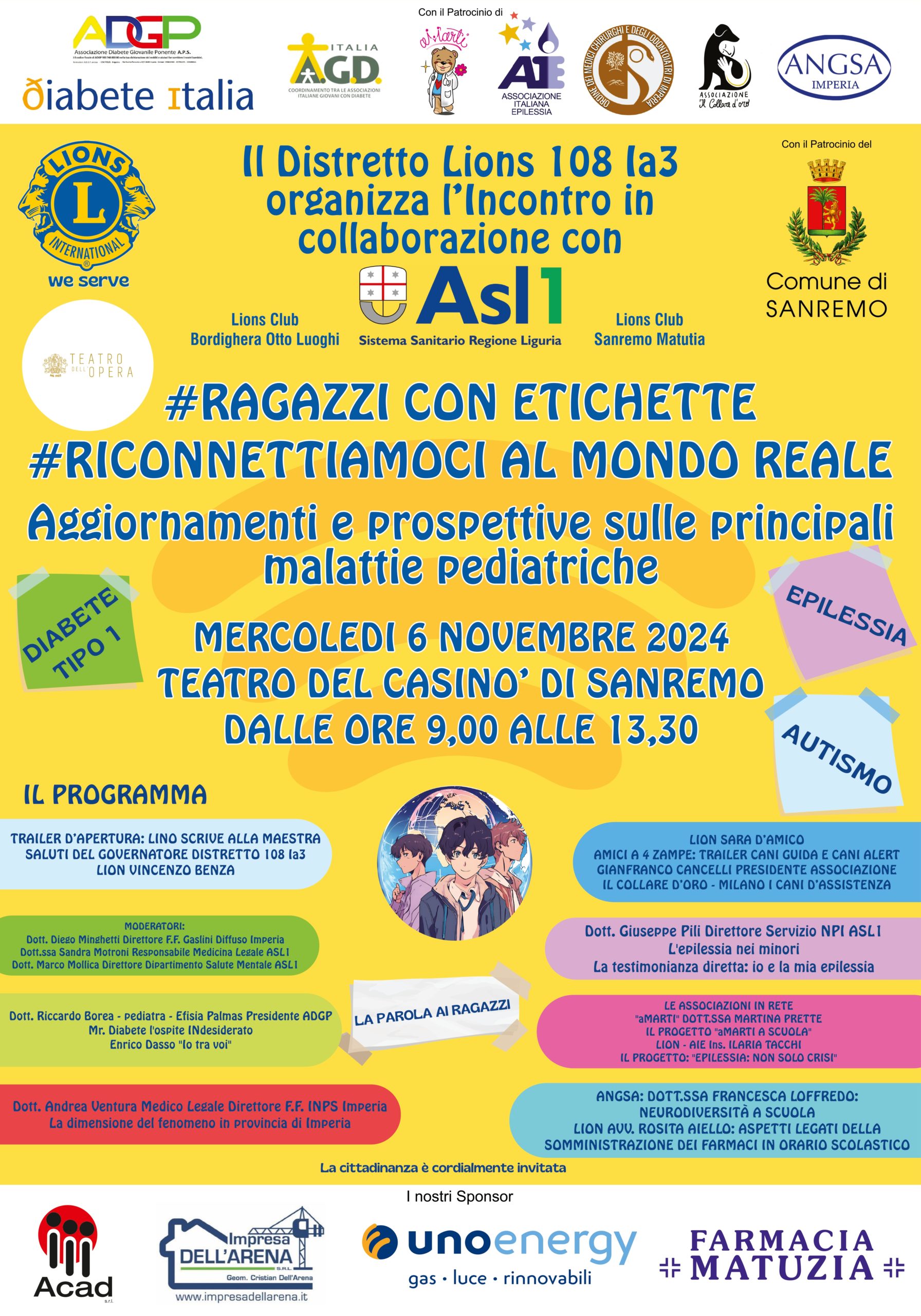 Il Distretto Lions 108 Ia3 in collaborazione con l’ASL imperiese, il Lions Club Bordighera Otto luoghi e il Lions Club Sanremo Matutia organizza, il 6 novembre presso il teatro del Casinò di Sanremo, un convegno sulle malattie pediatriche con focus su: Diabete di tipo 1, Autismo ed Epilessia.