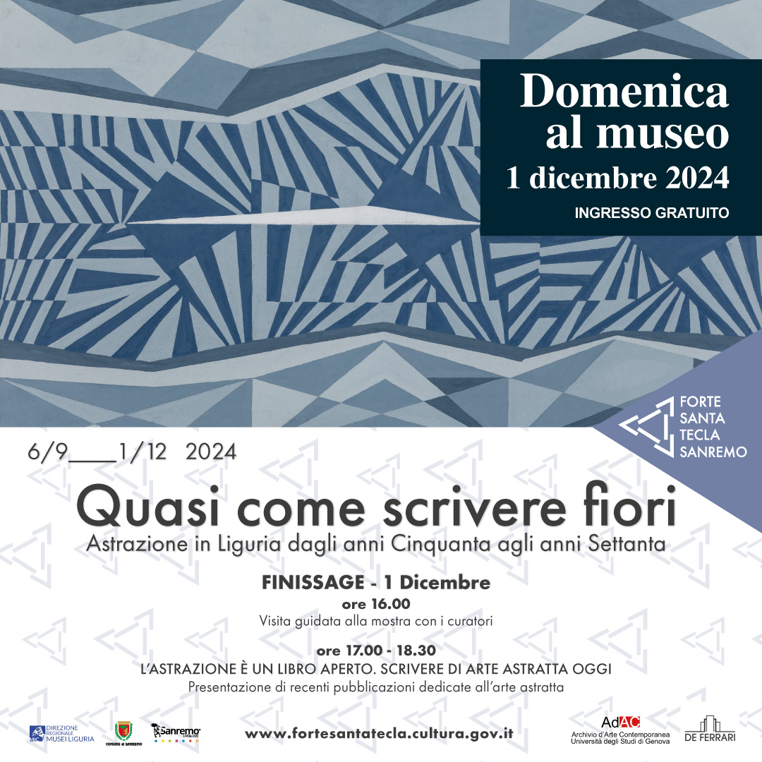 Ore 18.00: presentazione in anteprima del catalogo della mostra “Quasi come scrivere fiori. Astrazione in Liguria dagli anni Cinquanta agli anni Sessanta”.