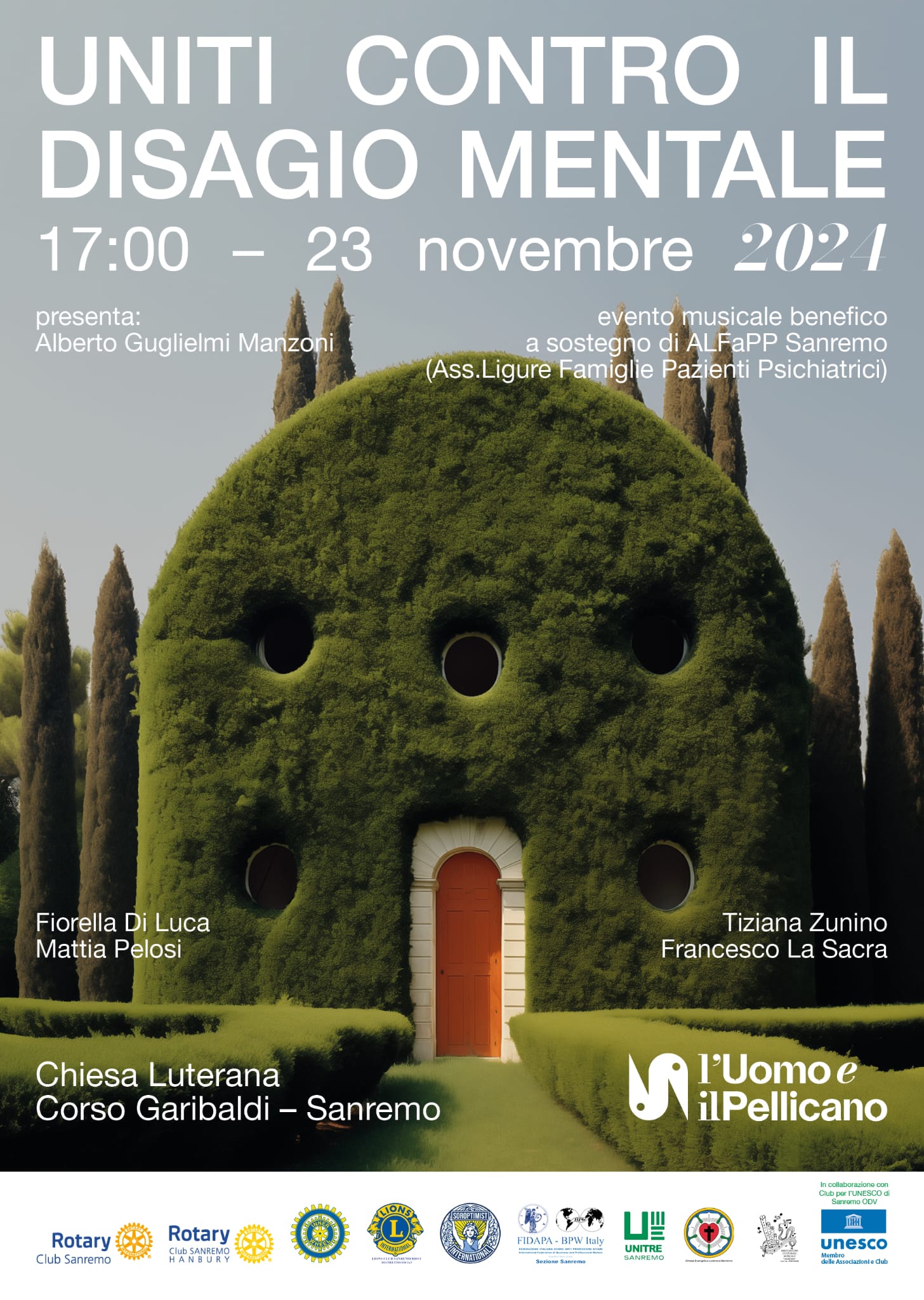 Il 23 novembre presso la Chiesa Luterana (Corso G. Garibaldi – Sanremo), alle ore 17.00, si terrà l’evento musicale benefico Uniti contro il disagio mentale. Ingresso libero.