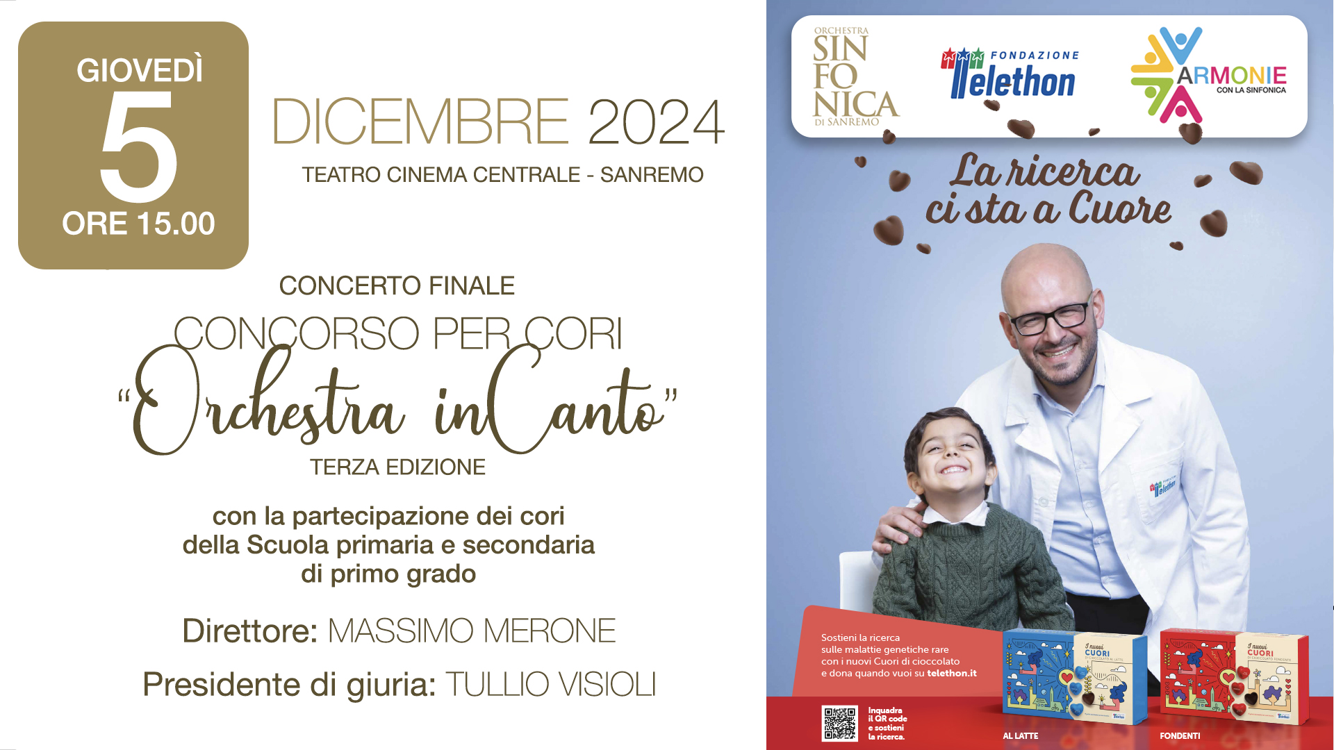 Alla finale di “Orchestra inCanto” sarà presente il corner dedicato alla Fondazione Telethon che si occupa da più di 30 anni, di ricerca sulle malattie genetiche rare e che nel mese di dicembre sarà impegnata nell’ormai classica Maratona televisiva trasmessa dalle reti RAI. Al corner Telethon allestito nel foyer del Teatro Ariston sarà possibile trovare i “Nuovi Cuori – i cioccolatini dal cuore grande” e molti altri prodotti solidali che potranno divenire buone idee regalo per Natale.