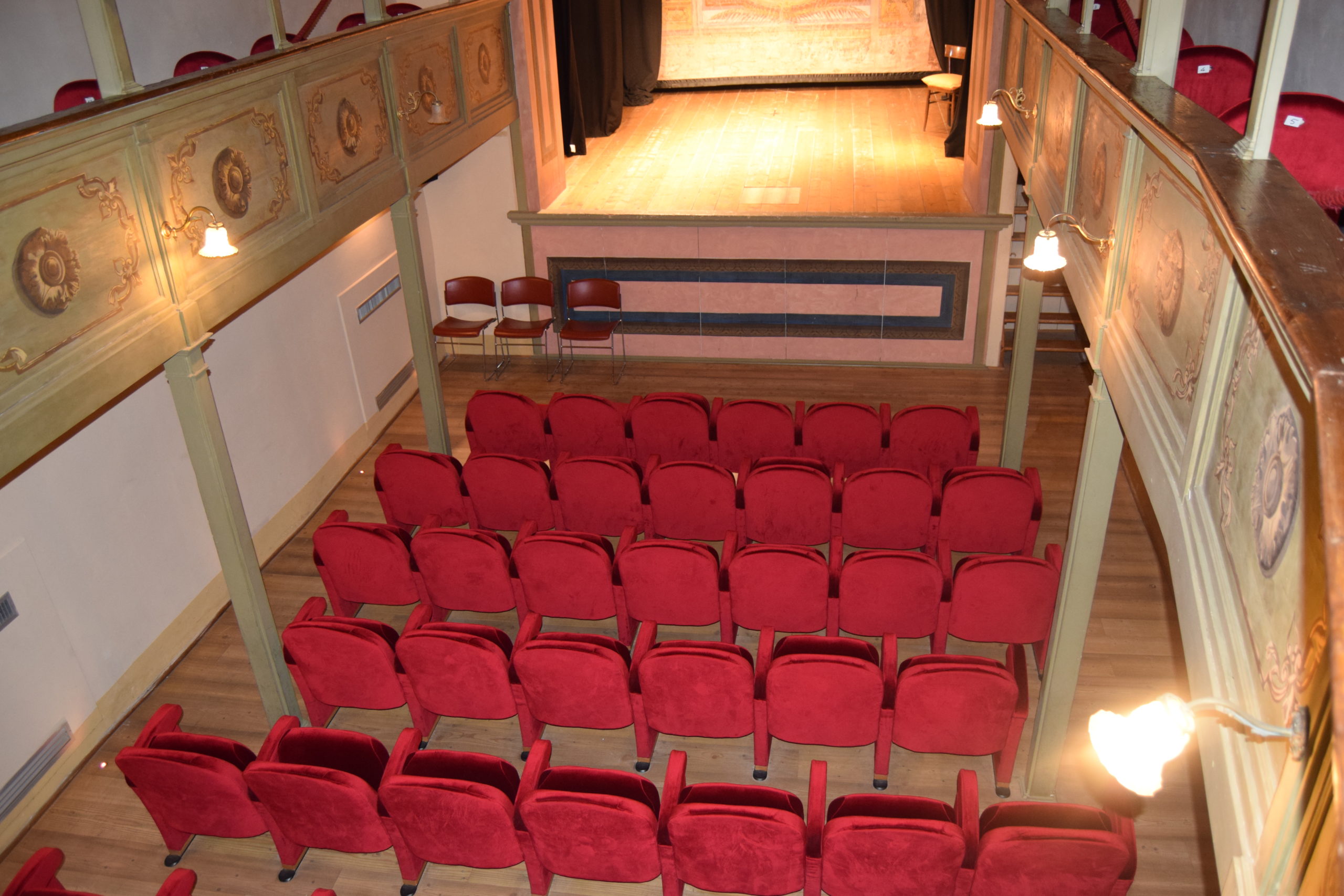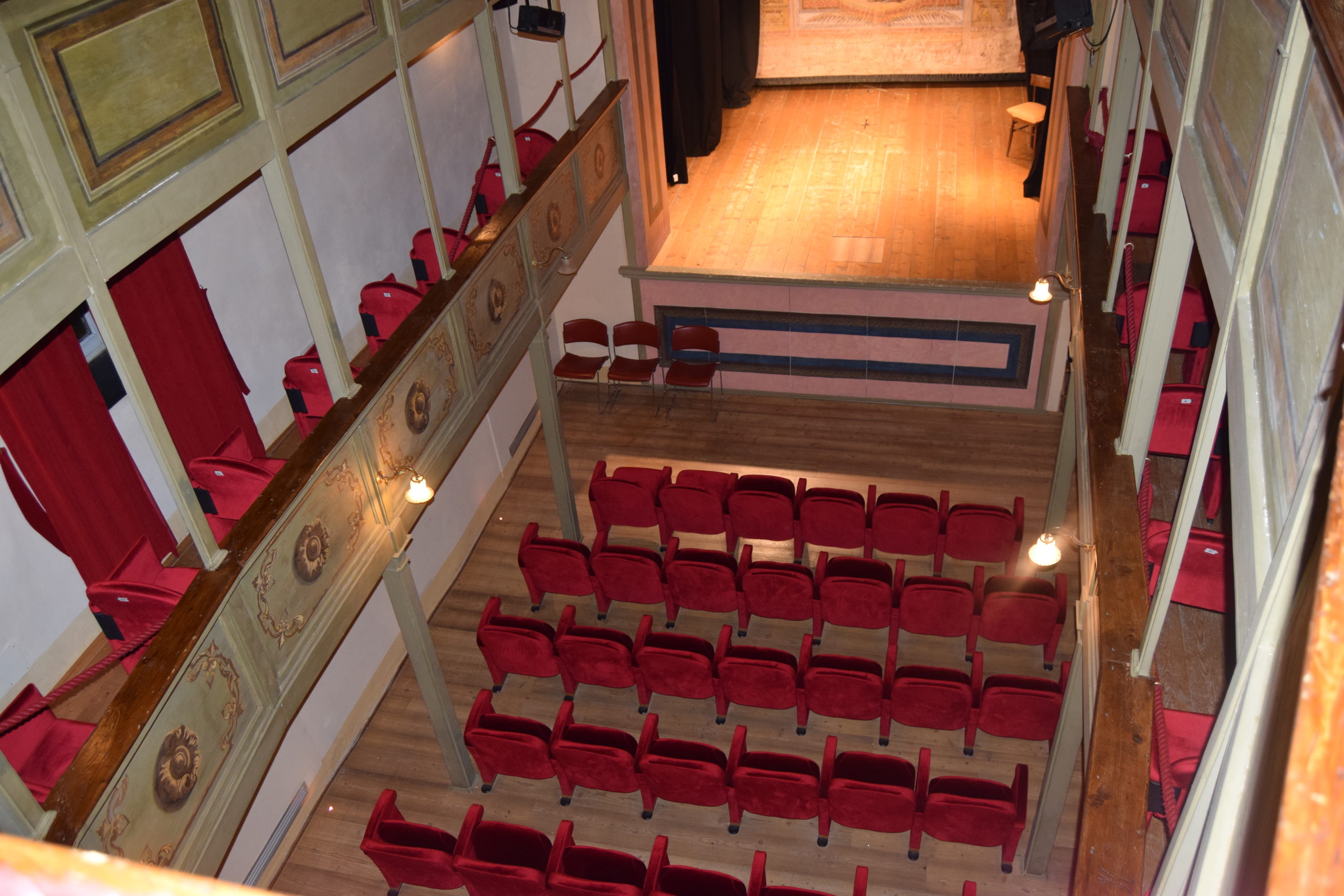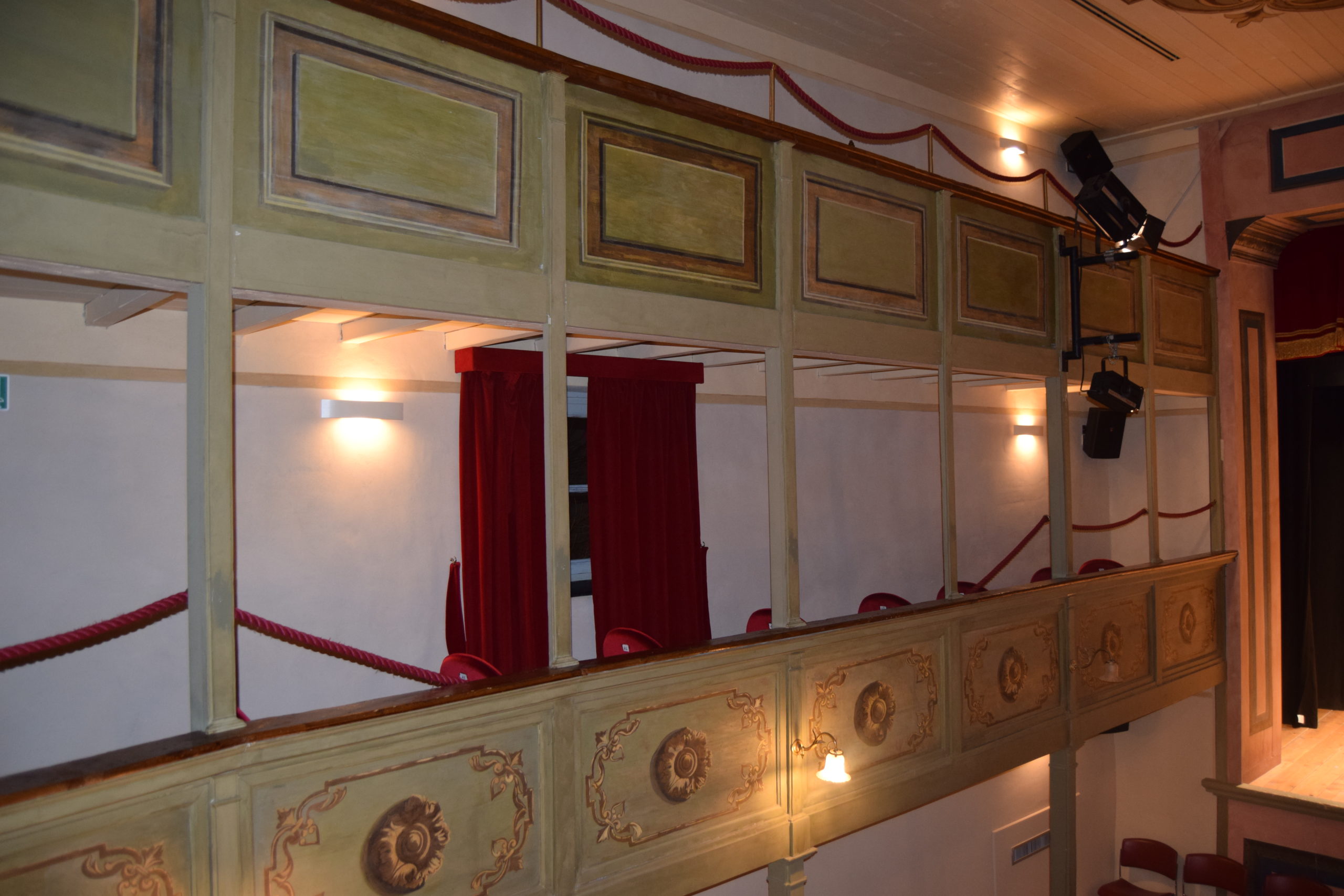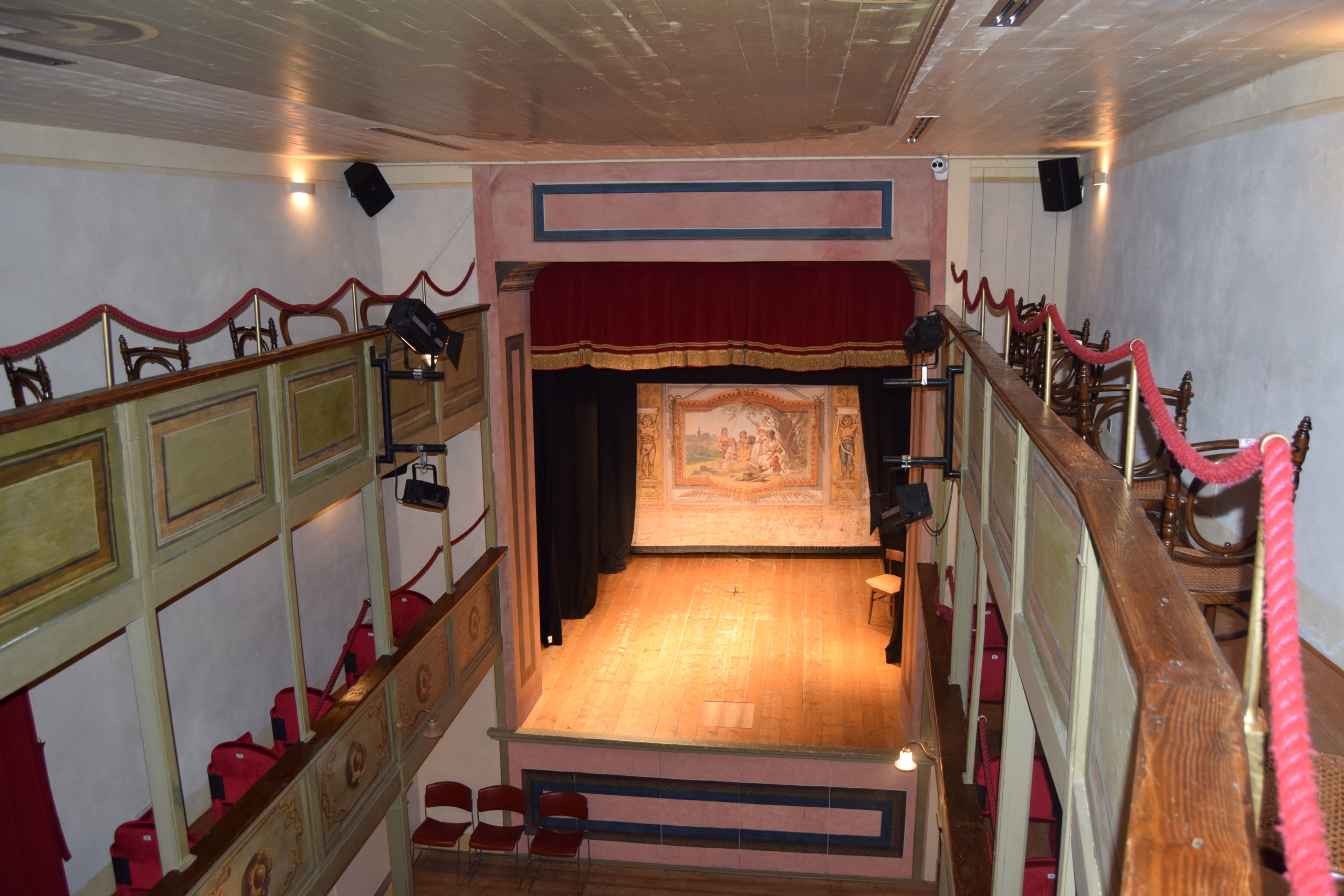 Da ricordare che tutta la struttura della sala, la sua copertura, il palcoscenico sono interamente in legno.
