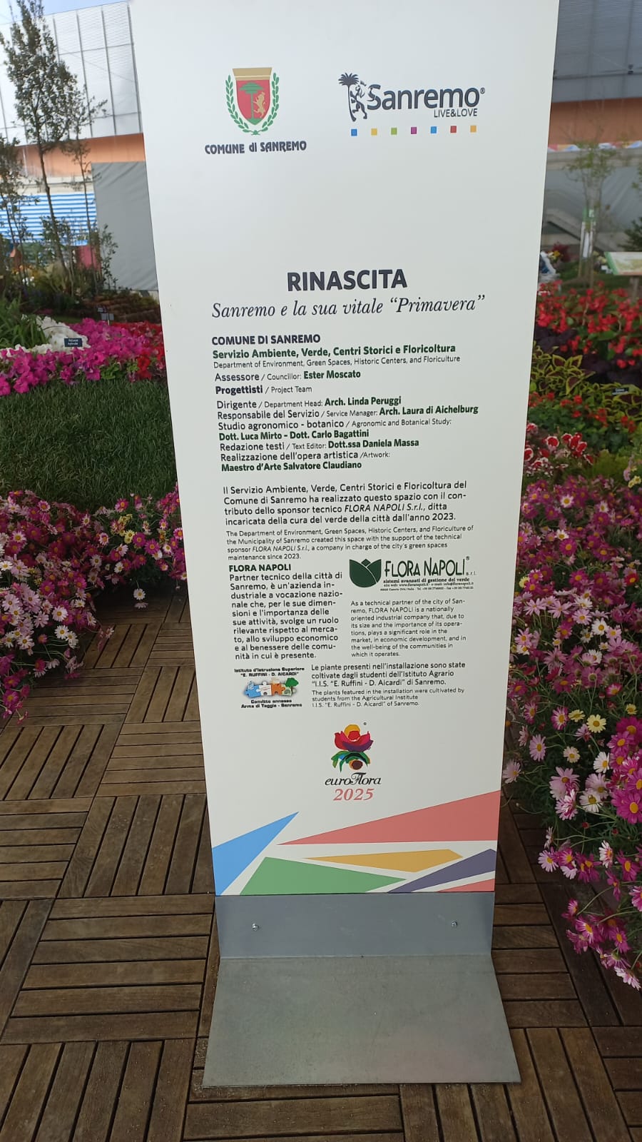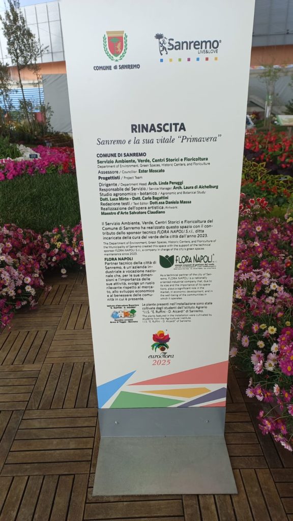 “E’ davvero una bella soddisfazione per il Comune di Sanremo – dichiarano il sindaco Alessandro Mager e l’assessore alla floricoltura Ester Moscato – essersi aggiudicato questo riconoscimento. Rivolgiamo quindi un sincero ringraziamento alla dirigente del Servizio Ambiente Linda Peruggi e alla responsabile Laura di Aichelburg alle quali va il merito della progettazione dello spazio, nonché ai tecnici Luca Mirto e Carlo Bagattini per lo studio agronomico e botanico funzionale alla progettazione e al maestro d’arte Salvatore Claudiano per l’opera artistica”.
