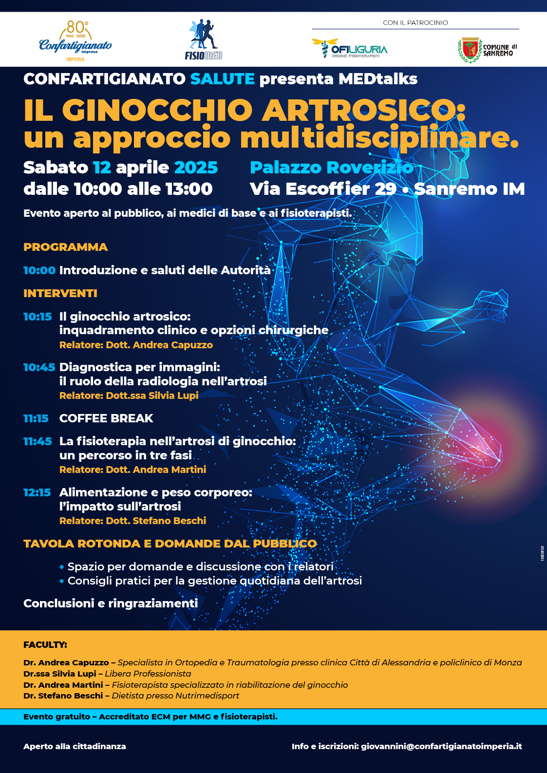 Grande partecipazione al terzo appuntamento del ciclo MEDTALKS, promosso da Confartigianato Salute con il patrocinio del Comune di Sanremo e dell’Ordine dei Fisioterapisti della Liguria, in collaborazione con Ambulatorio Fisiomed.