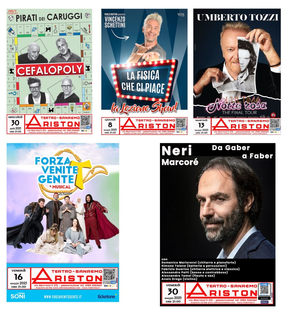 ![]() Programmazione Spettacoli aprile-maggio 2025 Il Teatro Ariston di Sanremo è lieto di presentare la sua ricca programmazione teatrale per il periodo dal 30 aprile al 30 maggio 2025. Un mese all’insegna della musica, della comicità, della danza e della cultura, con appuntamenti imperdibili per il pubblico di tutte le età.🎭 Programma degli Spettacoli. Mercoledì 30 aprile 2025 – Ore 21:00 “Cefalopoly” – I Pirati dei Caruggi Una satira brillante ambientata in una Genova trasformata in un gioco da tavolo, tra canzoni, sketch e monologhi. Prezzi: Platea: €30,00 + €3,00 prevendita; €27,00 + €3,00 prevenditaGalleria: €25,00 + €2,00 prevendita; €20,00 + €2,00 prevendita Venerdì 2. Domenica 4 maggio 2025 – Sanremo Dance Festival – 17ª edizione Tre giorni dedicati alla danza con esibizioni di scuole e compagnie provenienti da tutta Italia. Info: sanremodancefestival.it/ Giovedì 8 maggio 2025 – Ore 21:00 “La Fisica che ci piace – La Lezione Show!” – Vincenzo Schettini Il professore più amato del web porta sul palco una lezione-spettacolo che rende la fisica accessibile e divertente per tutti. Prezzi: Platea: €37,00 + €3,00 prevendita; €33,00 + €3,00 prevendita; €30,00 + €3,00 prevendita Galleria: €30,00 + €2,00 prevendita; €25,00 + €2,00 prevendita; €20,00 + €2,00 prevendita Martedì 13 maggio 2025 – Ore 21:00 “L’ultima Notte Rosa” – Umberto Tozzi Il celebre cantautore italiano si esibisce in un concerto che celebra la sua carriera, con i brani più amati dal pubblico. Prezzi:Platea: Poltronissima €70,00 + €10,50 prevendita; Poltrona €60,00 + €9,00 prevendita; Poltrona 2 €55,00 + €8,25 prevenditaGalleria: Prima fila €50,00 + €7,50 prevendita; Galleria 1 €45,00 + €6,75 prevendita; Galleria 2 €38,00 + €5,70 prevendita Venerdì 16 maggio 2025 – Ore 21:00 “Forza Venite Gente – Il Musical” Un musical coinvolgente che racconta la vita di San Francesco d’Assisi, tra musica e spiritualità. Prezzi:Platea: €42,00 + €6,00 prevendita; €38,00 + €5,00 prevendita; €34,00 + €4,00 prevenditaGalleria: €33,50 + €4,00 prevendita; €29,00 + €3,00 prevendita; €24,50 + €2,50 prevendita Riduzioni disponibili per under 14 e over 70 presso la biglietteria. Venerdì 30 maggio 2025 – Ore 21:00 “Da Gaber a Faber” – Neri Marcorè Un omaggio musicale e teatrale ai grandi cantautori italiani Giorgio Gaber e Fabrizio De André, interpretato da Neri Marcorè. Prezzi:Platea: €50,00 + €3,00 prevendita; €42,00 + €3,00 prevendita; €38,00 + €3,00 prevenditaGalleria: € 35,00 + € 3,00 prev. – € 30,00 + € 2,00 prev. – € 25,00 + € 3,00 Per ulteriori informazioni e per l’acquisto dei biglietti, si prega di visitare il sito ufficiale del Teatro Ariston: aristonsanremo.com oppure in cassa 0184 506060 orario 17:00-21:00 tutti i giorni |