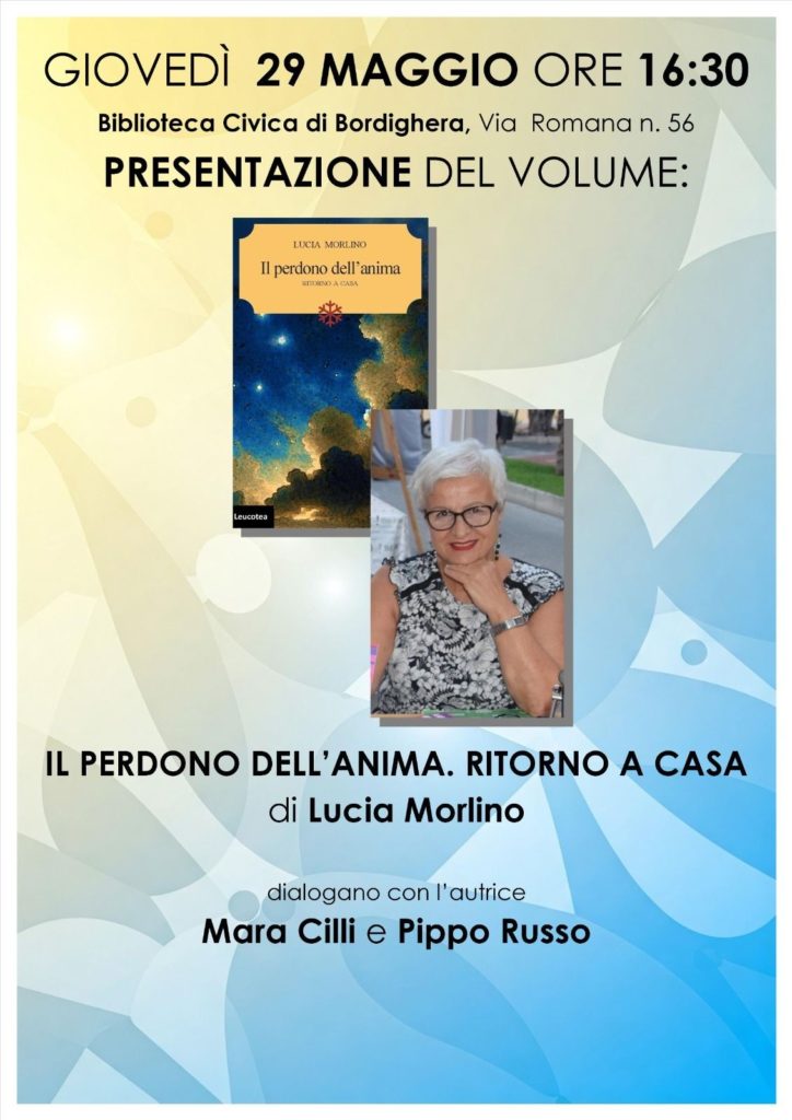 Giovedì 29 maggio 2025 alle 16.30 la Biblioteca Civica Internazionale di Bordighera accoglierà l’autrice Lucia Morlino che presenterà al pubblico, dialogando con Mara Cilli e Pippo Russo, il romanzo “Il perdono dell’anima. Ritorno a casa”. Protagonista della storia è Sandra che, dopo una fuga in Messico per sottrarsi a un dolore profondo, torna in patria per affrontare il padre che ancora l’accusa di aver tradito la famiglia; è l’inizio di un percorso di comprensione non facile, ma che dovrà essere vissuto.