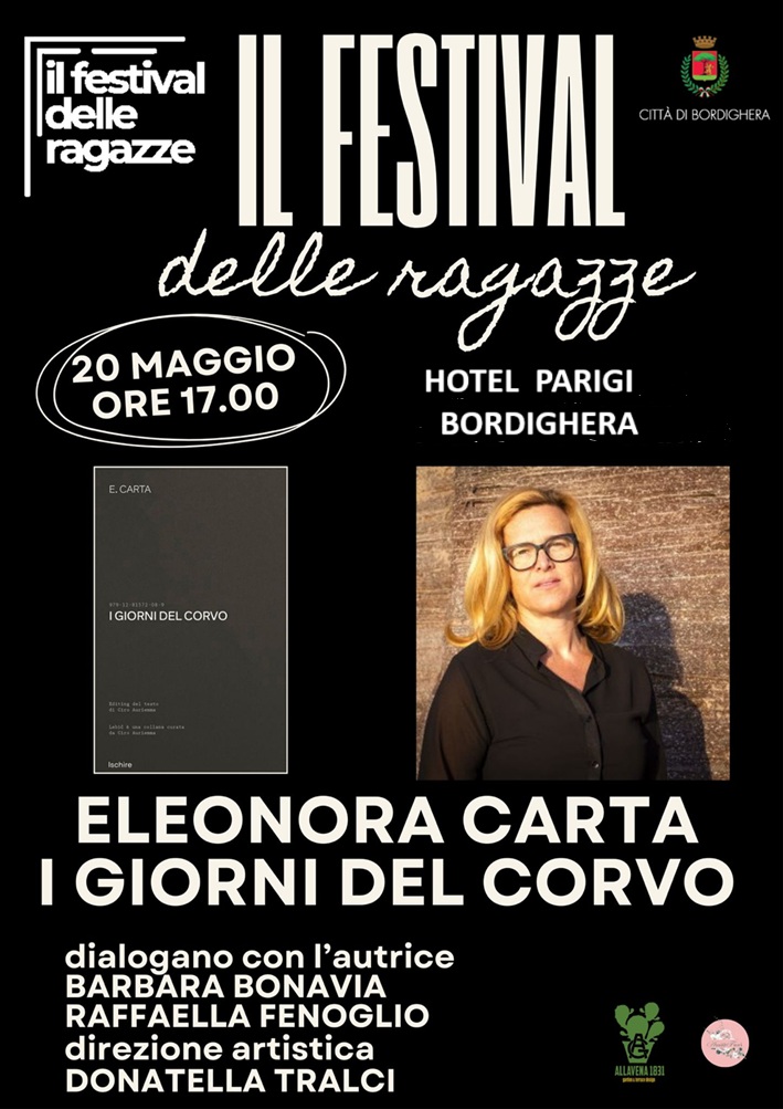 MARTEDI’ 20 MAGGIO 2025 ORE 17:00 – HOTEL PARIGI BORDIGHERA – IL FESTIVAL DELLE RAGAZZE presenta BREVE STORIA DELLA LETTERATURA GIALLA: a cura della giallista ELEONORA CARTA con il libro I GIORNI DEL CORVO che vede protagonista il Maggiore Linda De Falco e il saggio BREVE STORIA DELLA LETTERATURA GIALLA: