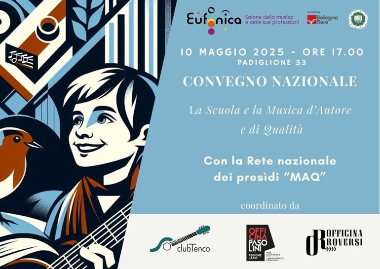 Oggi, sabato 10 maggio, alle ore 17.00 a Bologna si terrà il terzo incontro della Rete MAQ (Musica d’Autore e di Qualità) LA SCUOLA E LA MUSICA D’AUTORE E DI QUALITÀ presso gli spazi di BolognaFiere (padiglione 33) nell’ambito di Eufonica, Salone della musica e delle sue professioni.