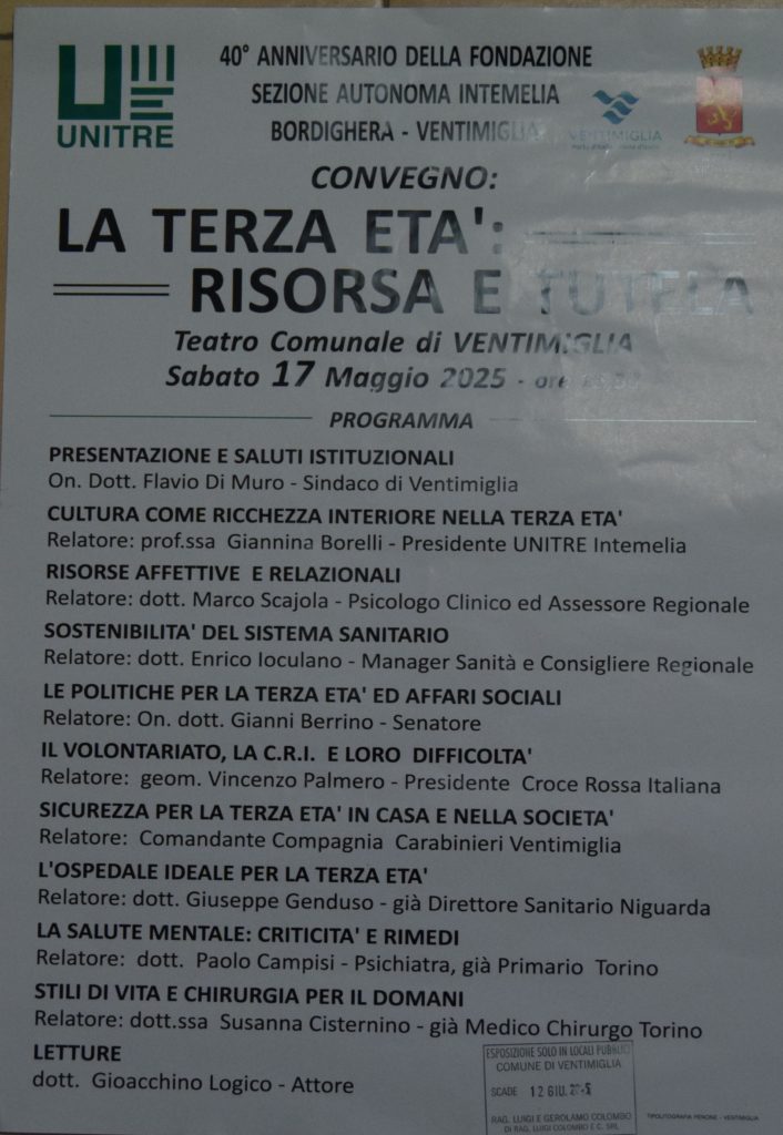 Sabato 17 maggio 2025 alle ore 15:30, presso il Teatro Comunale di Ventimiglia avrà luogo il convegno “LA TERZA ETA’ RISORSA E TUTELA”