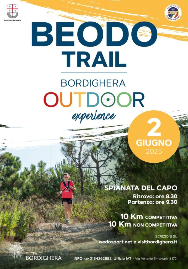 Lunedì 2 giugno, nell’ambito della rassegna Bordighera Outdoor Experience organizzata dal Comune di Bordighera con il patrocinio di Regione Liguria, si terrà la terza edizione della Beodo Trail, quest’anno con una grande novità : gli amanti delle camminate nella natura e della corsa potranno partecipare scegliendo tra modalità competitiva e non competitiva, entrambe su un percorso di 10 km con un dislivello di circa 500 metri. Il tracciato partirà dalla spianata del Capo per poi proseguire lungo il suggestivo sentiero del Beodo fino a Montenero, attraversando scorci panoramici unici e tratti immersi nel verde.