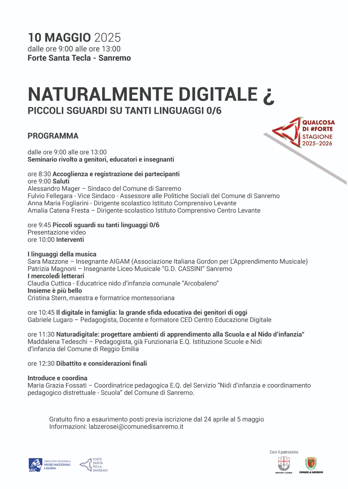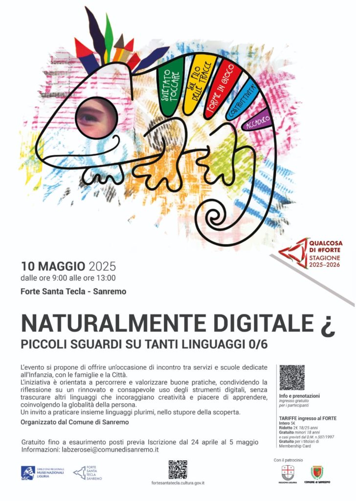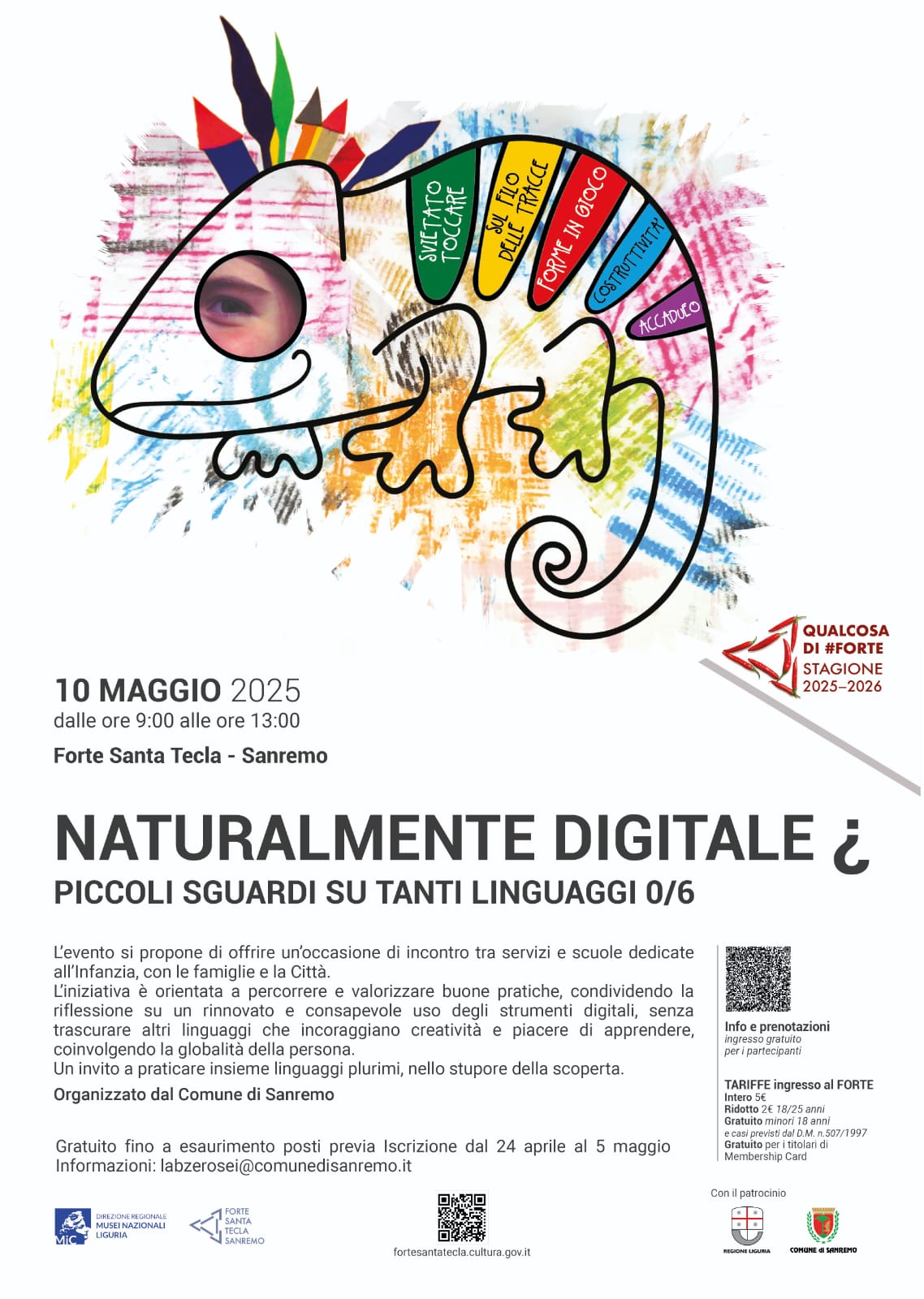 Sabato 10 maggio il Forte di Santa Tecla ospita il seminario “Naturalmente Digitale, Piccoli sguardi su tanti linguaggi 0/6”, ovvero una nuova occasione di incontro tra servizi e scuole dedicati all’infanzia e alla città, rivolte a insegnanti, educatori e genitori (dalle 9 alle 13).