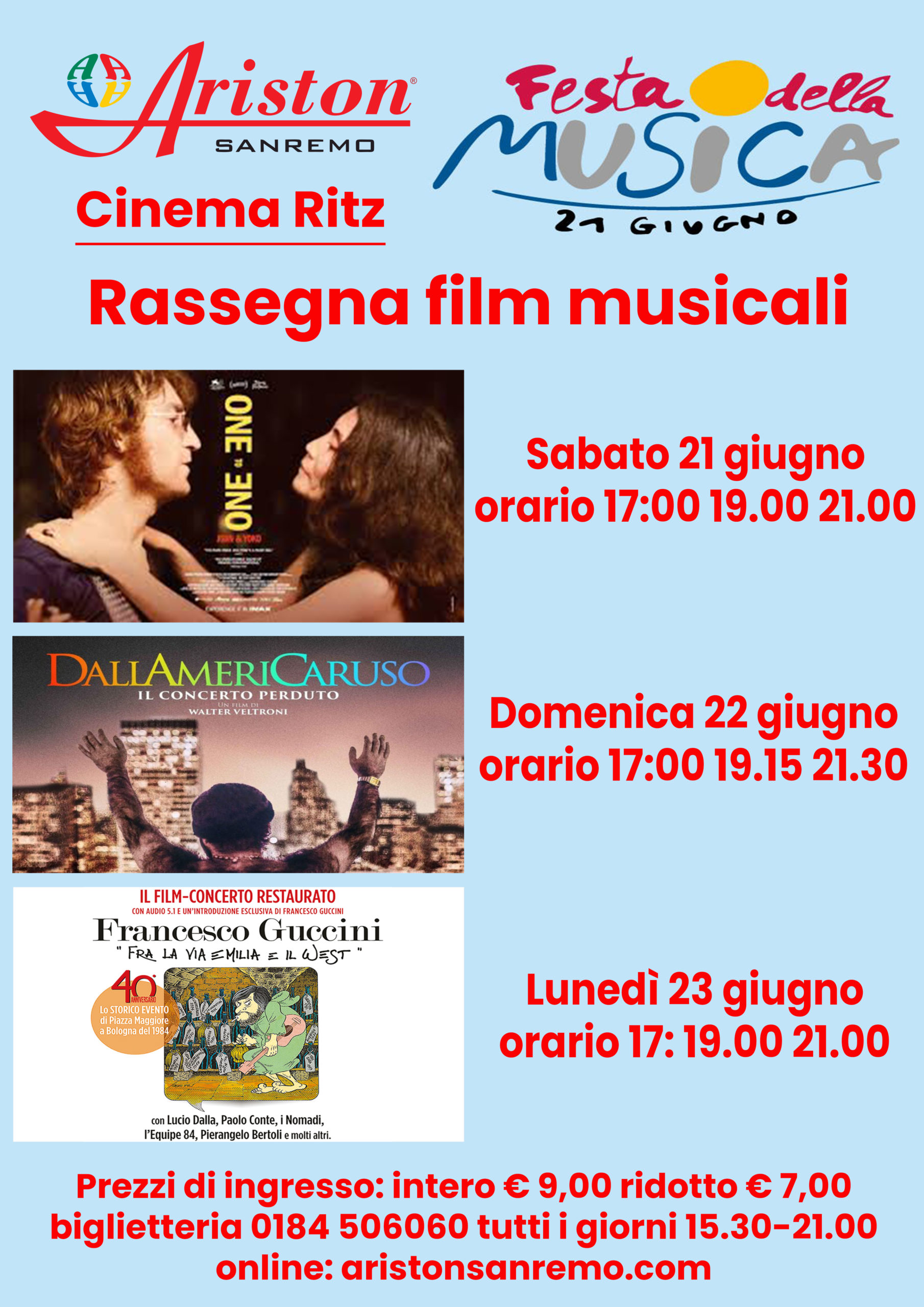 In occasione della Festa della Musica che si celebra il 21 giugno e dei vari eventi organizzati nella città di Sanremo per la ricorrenza, il cinema-teatro Ariston propone una speciale rassegna cinematografica che trasformerà la Sala Ritz in un punto di incontro per gli amanti della musica e del cinema. Da sabato 21 a lunedì 23 giugno, tre giornate consecutive dedicate a documentari e film-concerto che raccontano momenti iconici della storia della musica italiana e internazionale.