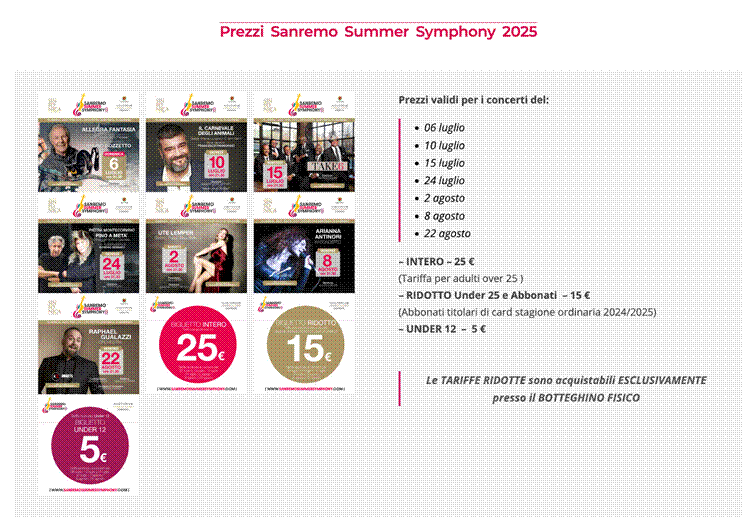 I biglietti sono disponibili in prevendita sul sito https://www.sanremosummersymphony.com