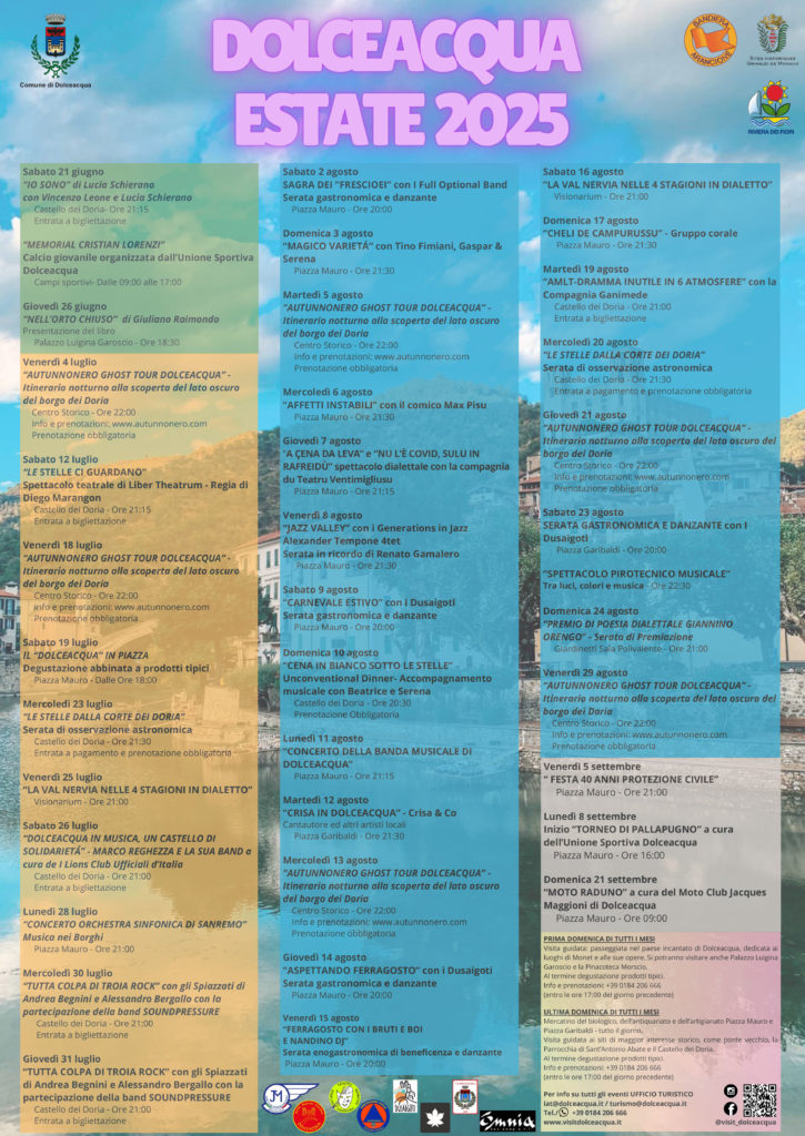 L’elenco completo degli eventi è consultabile sul sito ufficiale del turismo www.visitdolceacqua.it e sui canali social del Comune. È possibile iscriversi alla newsletter per ricevere aggiornamenti in tempo reale.