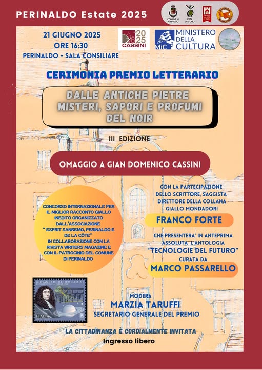 Sabato 21 giugno 2025 alle ore 16:30 nella Sala Sala consiliare del Comune di Perinaldo, avrà luogo la cerimonia del Premio Letterario “DALLE ANTICHE PIETRE MISTERI, SAPORI E PROFUMI DEL NOIR”.