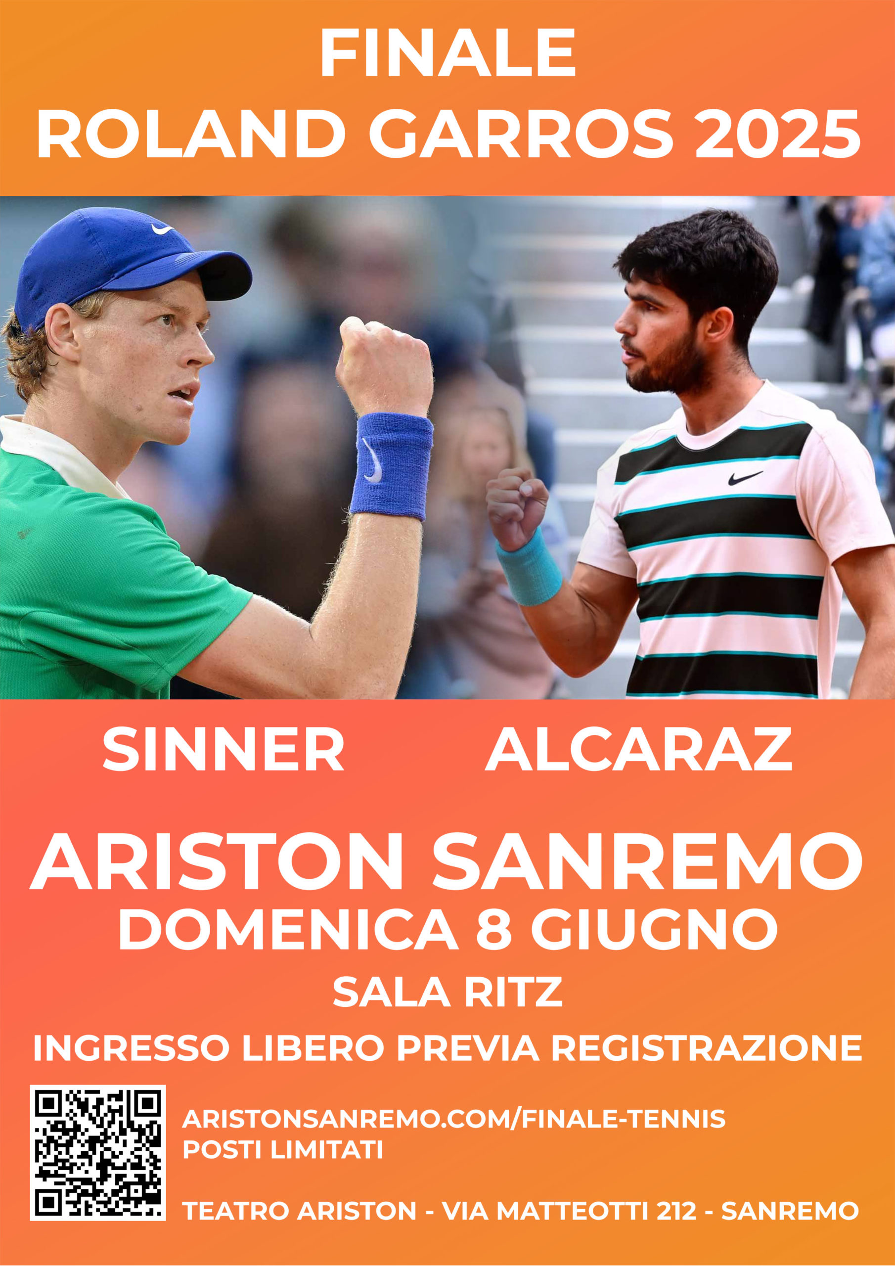 Il grande tennis approda sul grande schermo! Domenica 8 giugno 2025, alle ore 15:00 (orario da confermare), il Cinema Ritz del Teatro Ariston di Sanremo ospiterà la proiezione in diretta della finale del Roland Garros 2025, che vedrà protagonisti Jannik Sinner e Carlos Alcaraz in una sfida epica per il titolo.