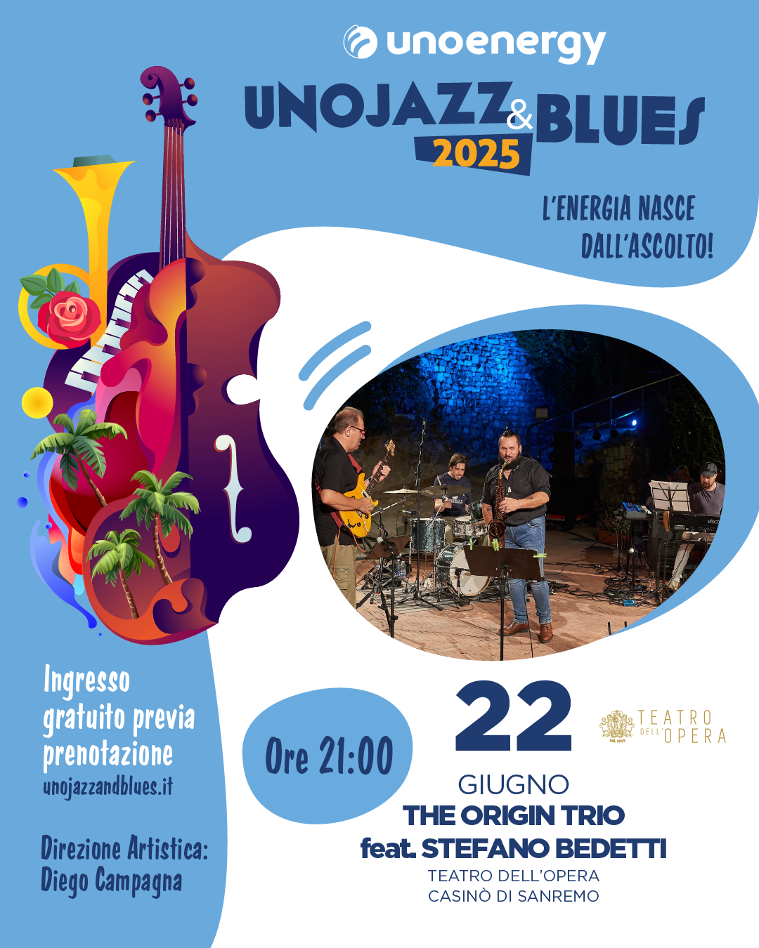 Domenica 22 giugno alle ore 21 presso il teatro dell’Opera del Casinò di Sanremo terzo appuntamento con la rassegna Unojazz&blues sotto la Direzione Artistica di Diego Campagna. Protagonisti della serata The Origin Trio feat. Stefano Bedetti.