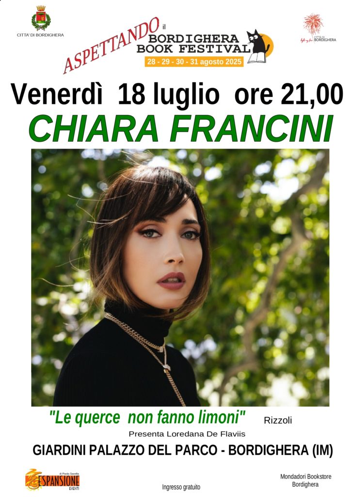 Si svolgerà VENERDI’ 18 luglio l’incontro con Chiara Francini a Bordighera nel progetto “Aspettando il Bordighera Book Festival”