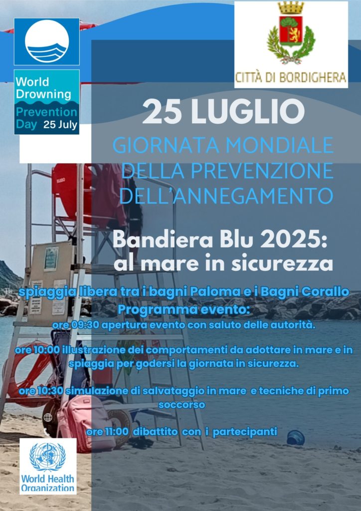 Venerdì 25 luglio a Bordighera e in tutti i 246 Comuni Bandiera Blu avrà luogo “Bandiera Blu: al mare in sicurezza”, evento voluto fa FEE Italia per il World Drowning Prevention Day con l’obiettivo di sensibilizzare la Cittadinanza su un corretto e più sicuro rapporto con il mare.