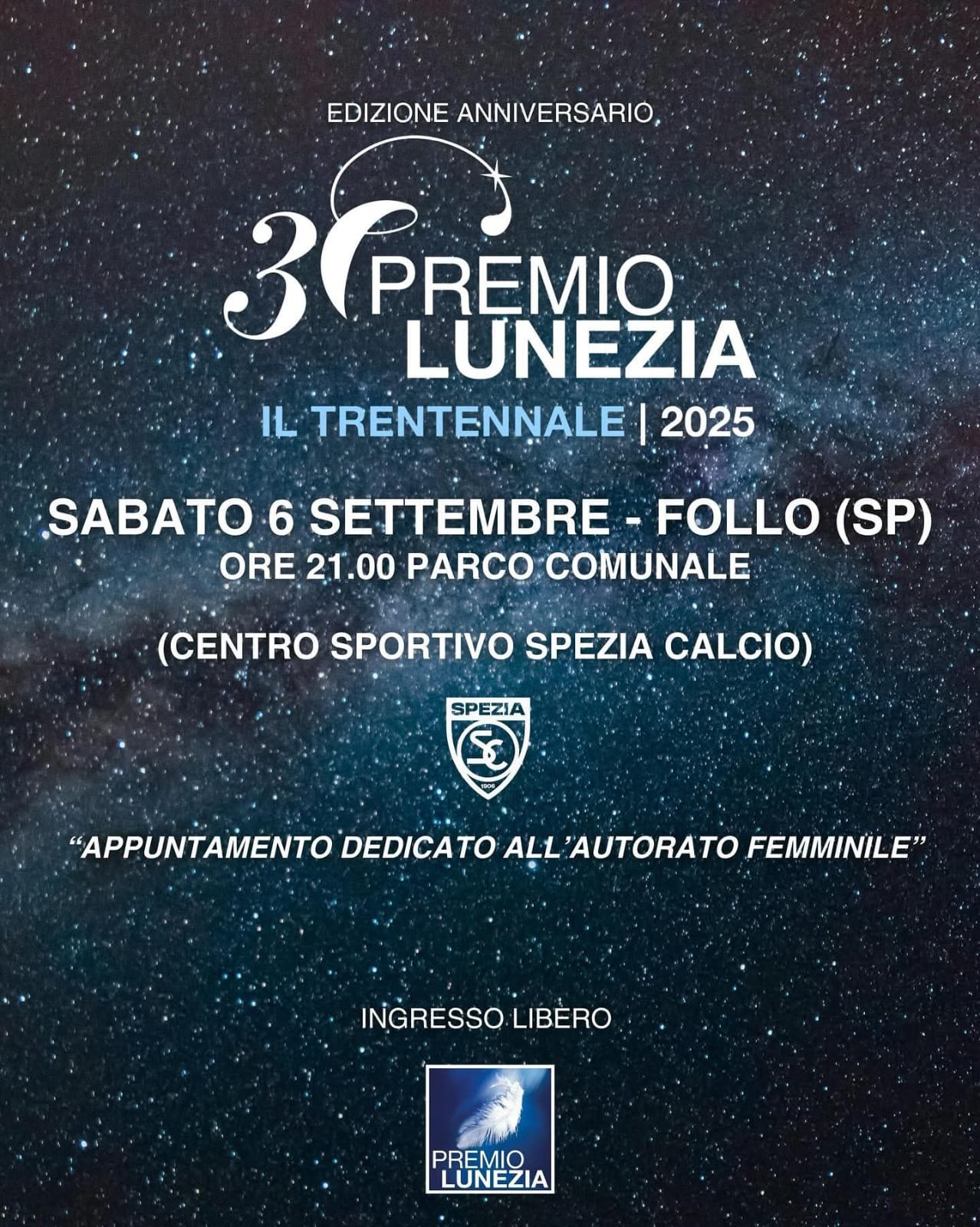 Il Premio Lunezia, manifestazione storica dedicata al valore musical-letterario della canzone, prosegue il percorso celebrativo per il suo trentennale con 3 nuove tappe: sabato 6 settembre a Follo (La Spezia) al Centro Sportivo dello Spezia Calcio, domenica 14 settembre a Roma, di fronte al Colosseo (Jazz e Image) e domenica 19 ottobre a La Spezia al Teatro Civico.