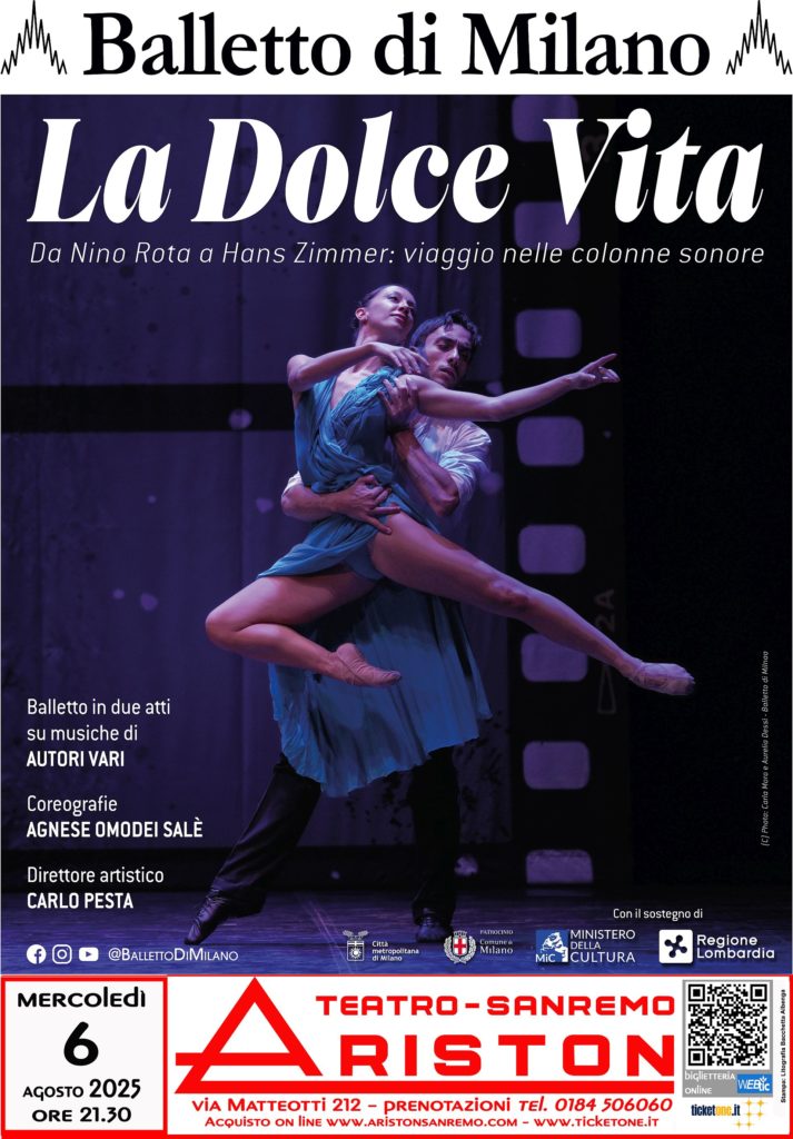 Il balletto La Dolce Vita: da Nino Rota a Hans Zimmer è un omaggio al potente legame tra musica e cinema. Attraverso le coreografie di Agnese Omodei Salè, lo spettacolo trasporta il pubblico in un viaggio emozionante tra le colonne sonore più iconiche del grande schermo, celebrando compositori leggendari premiati con Oscar, BAFTA e David di Donatello. Le scene evocate richiamano immagini