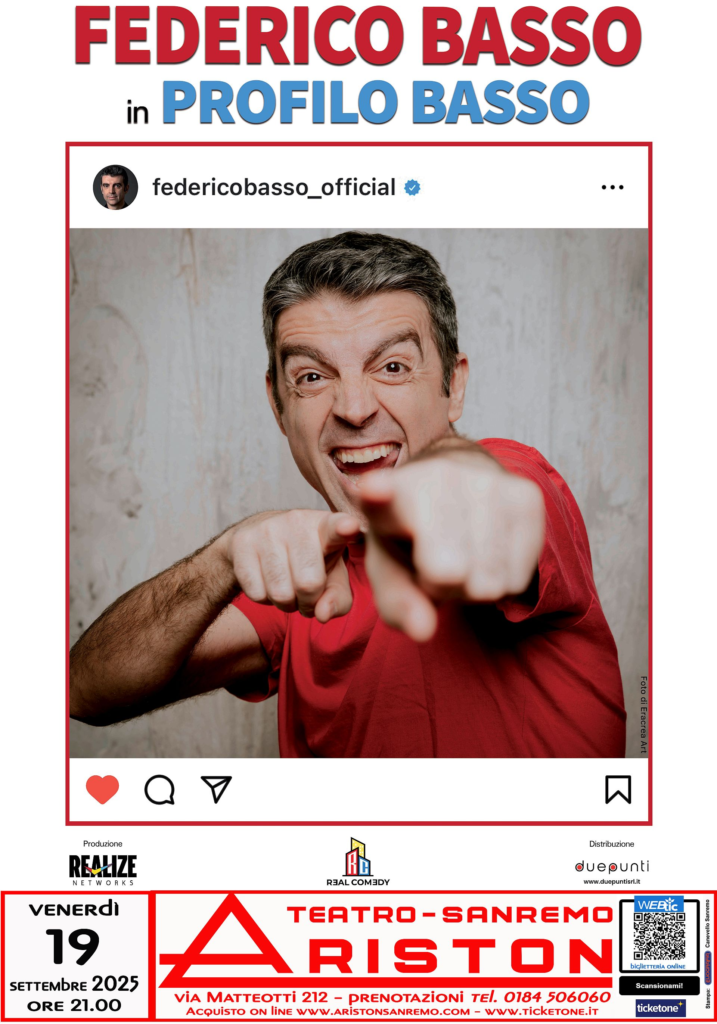 Si comunica che Federico Basso, comico di talento e vincitore della quinta edizione di LOL – Chi ride è fuori, porterà in scena il suo coinvolgente one‑man‑show “Profilo Basso” venerdì 19 settembre 2025 alle 21:00 presso il prestigioso Teatro Ariston di Sanremo. Lo spettacolo