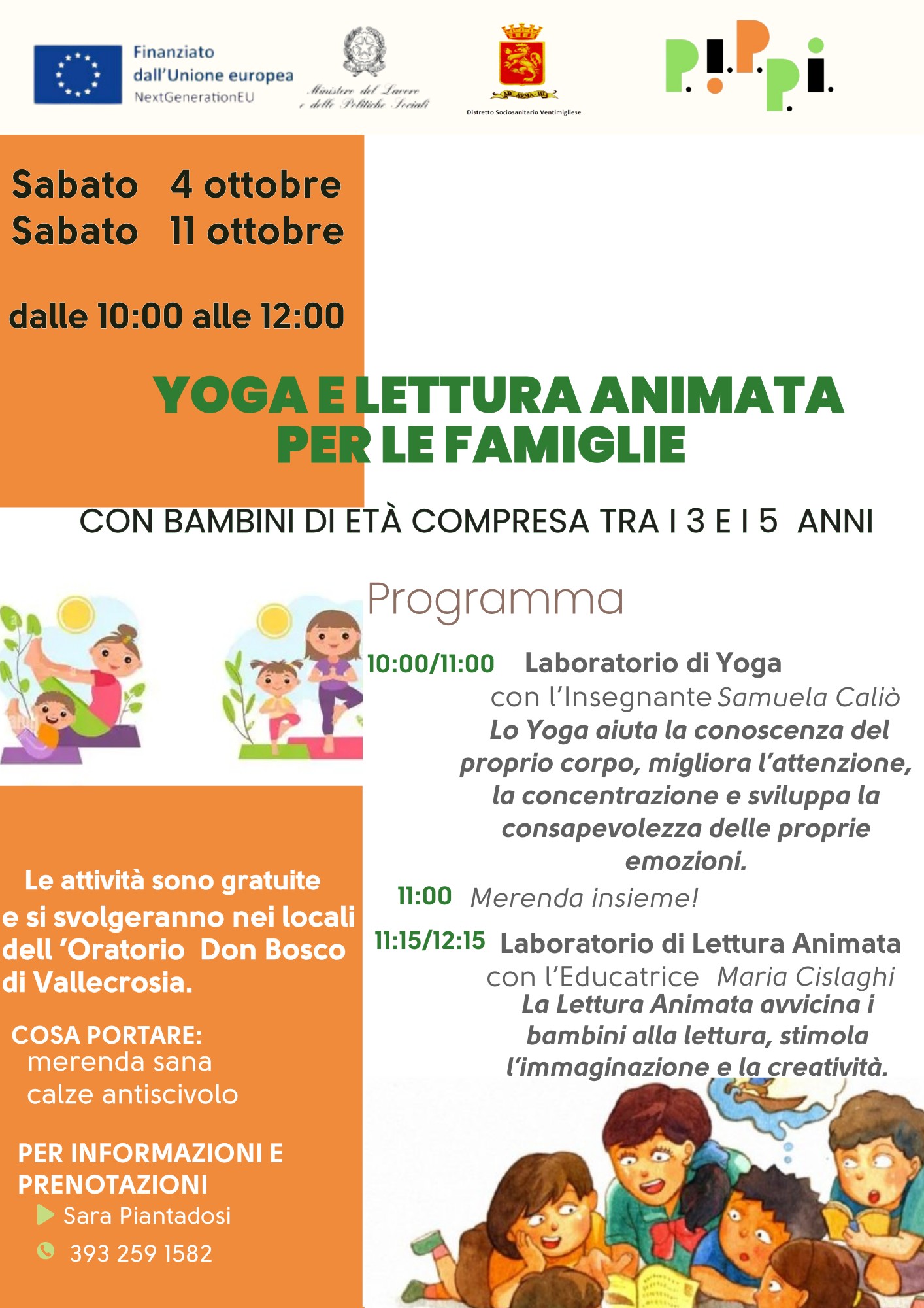 Dalle 10 alle 12, presso l’Oratorio Don Bosco di Vallecrosia, i bimbi tra i 3 e i 5 anni e le loro famiglie potranno essere protagonisti di due mattinate all’insegna di yoga e letture animate. Filo conduttore delle attività saranno l’espressività del corpo e l’espressività creativa, per un arricchimento sia fisico che mentale supportato da esperti professionisti.
