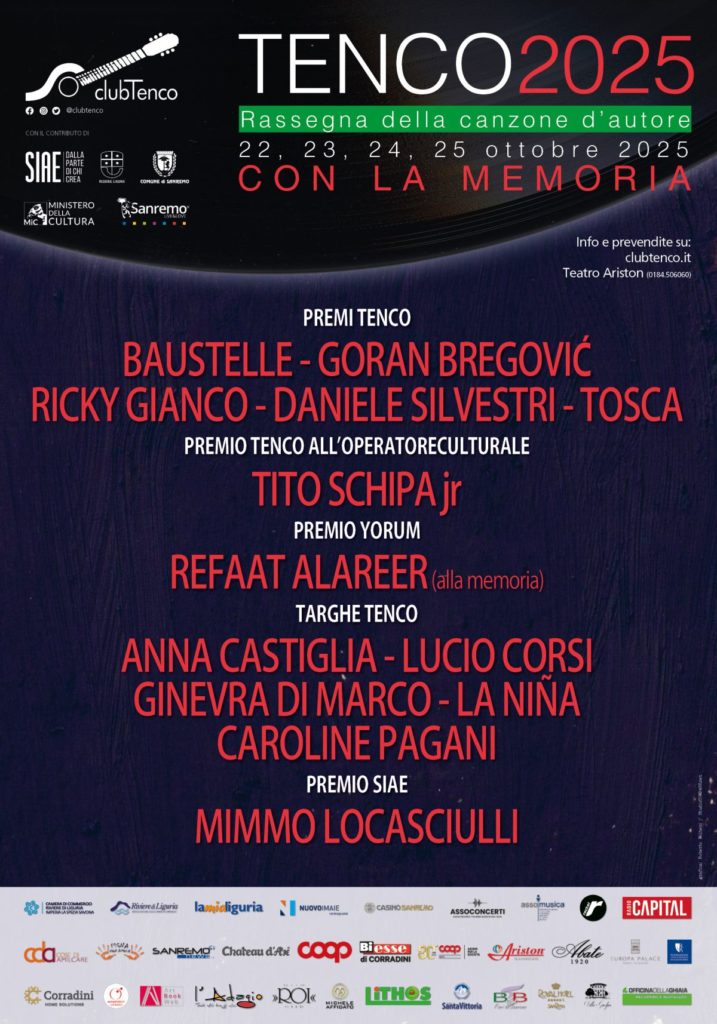 Sempre il Direttivo del Club Tenco ha assegnato in questa edizione il PREMIO TENCO ALL’OPERATORE CULTURALE a TITO SCHIPA JR. e il PREMIO YORUM alla memoria di REFAAT ALAREER, poeta e attivista palestinese morto nel 2023, insieme a suo fratello, sua sorella e i suoi tre figli in un attacco aereo israeliano nel nord di Gaza. Durante la sua carriera, insegnò letteratura e scrittura creativa all’Università Islamica di Gaza e co-fondò We Are Not Numbers, un’organizzazione per mettere in contatto autori internazionali con giovani scrittori di Gaza, promuovendo la narrazione come strumento di resistenza palestinese. Il riconoscimento è stato consegnato il 25 ottobre al cantautore e giornalista Nabil Bey Salameh, co-fondatore del gruppo italo-palestinese Radiodervish, alla presenza di Federico Lera di Amnesty International Italia. Il Premio Yorum è istituito in collaborazione con Amnesty International Italia dal 2020 per dare visibilità agli artisti che in tutto il mondo, mettendo spesso a repentaglio la loro vita, lottano per i diritti umani e la libertà d’espressione. Quest’anno per la prima volta il Grup Yorum – che ha dato il nome a questo riconoscimento – si è esibito sul palco dell’Ariston.