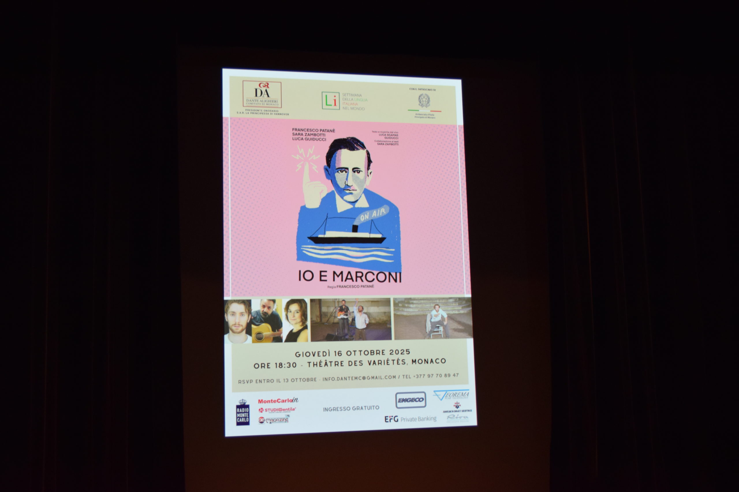 Nella serata di giovedì 16 ottobre 2025, al Théâtre des Variétés nel Principato di Monaco, ha avuto luogo lo spettacolo teatrale “Io e Marconi” nell’ambito della XXV° Settimana della Lingua Italiana nel Mondo: “Italofonia: lingua oltre i confini”