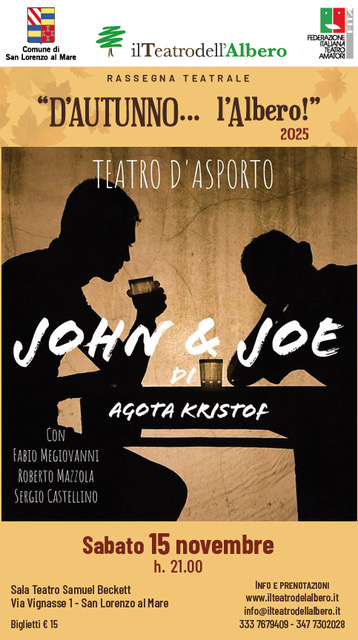 Oggi sabato 15 novembre 2025 alle ore 21 inizia la Rassegna Teatrale a San Lorenzo al Mare con lo spettacolo John e Joe di Agota Kristof del Teatro d’Asporto, la classica Rassegna Autunnale con la direzione artistica di Franco La Sacra del Teatro dell’Albero, in collaborazione con il Comune di San Lorenzo al Mare.