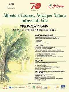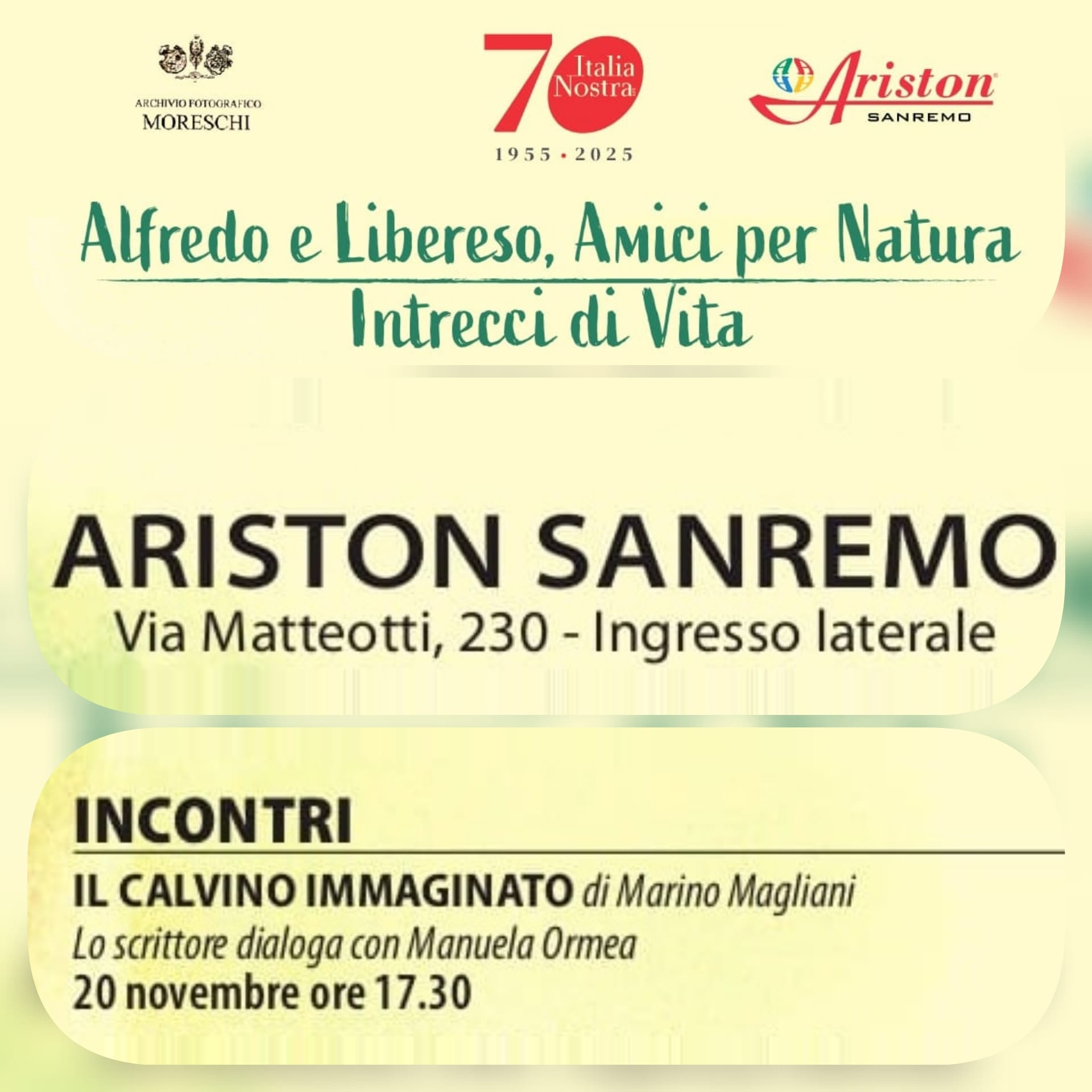 Giovedì 20 novembre ore 17.30, nell’ambito della MOSTRA “ALFREDO E LIBERESO, AMICI PER NATURA. INTRECCI DI VITA”, che si tiene nei locali ex Whisky a Gogo nel complesso Ariston (Via Matteotti 230) e promossa da Ariston Sanremo, Italia Nostra Sanremo Taggia e Archivio Fotografico Moreschi, si tengono una serie di appuntamenti ed incontri che si collegano con il mondo dei due protagonisti, Alfredo Moreschi e Libereso Guglielmi.Dopo il Convegno sul Cinema a Sanremo tenutosi al Ritz, ecco il primo incontro che si tiene nella stessa sede della Mostra con la partecipazione dello scrittore, sceneggiatore e traduttore MARINO MAGLIANI in dialogo con la Prof.ssa MANUELA ORMEA.