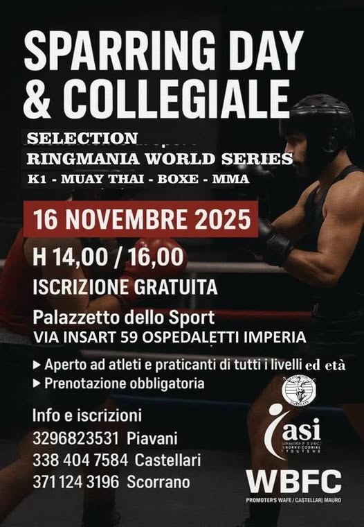 K1/Muay Thai/Boxe/MMA – Il Palazzetto dello Sport di via Isnart domenica dalle h.14 alle h.16 ospita un importante evento dedicato agli sport da combattimento. Organizzato dalla WBFC (World Boxing Fighters Corporation) del presidente Franco Scorrano – responsabile nazionale ASI degli sport da combattimento moderno – e dal vice-presidente Alessandro Piavani, con la fondamentale collaborazione locale del Maestro Mauro Castellari di Ospedaletti.