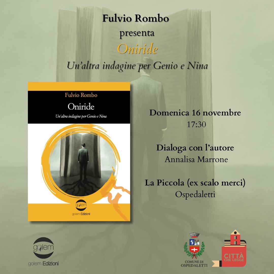 Presentazione libro – Sempre nella giornata di domenica 16 novembre alle h.17,30 presso il Centro Culturale La Piccola in via Cavalieri di Malta, è in programma la presentazione dell’ultima opera letteraria dello scrittore sanremese Fulvio Rombo. Si tratta di “Oniride” (ed.Golem), terzo romanzo di una trilogia iniziata con “Ayahuasca” nel 2022 e proseguita l’anno dopo con “Profanazione”.