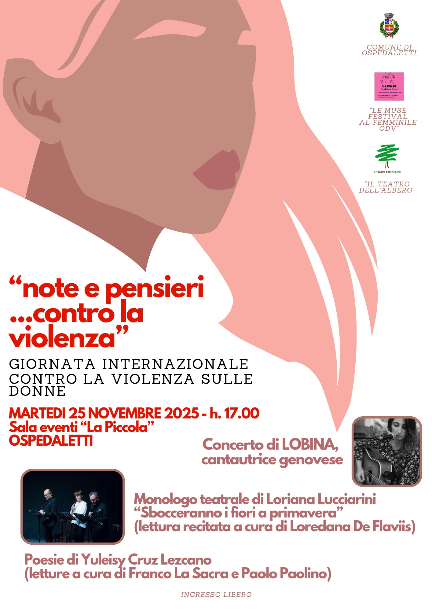 Domani, martedì 25 novembre alle h.17 presso il Centro Culturale La Piccola in via Cavalieri di Malta si svolgerà uno spettacolo di musica, teatro e poesia con la partecipazione del Teatro dell’Albero. In programma il concerto della cantautrice genovese Lobina, il monologo recitato da Loredana De Flaviis dal titolo “Sbocceranno i fiori a primavera” di Loriana Lucciarini, e la lettura di alcune poesie di Yuleisy Cruz Lezcano a cura di Franco La Sacra e Paolo Paolino.
