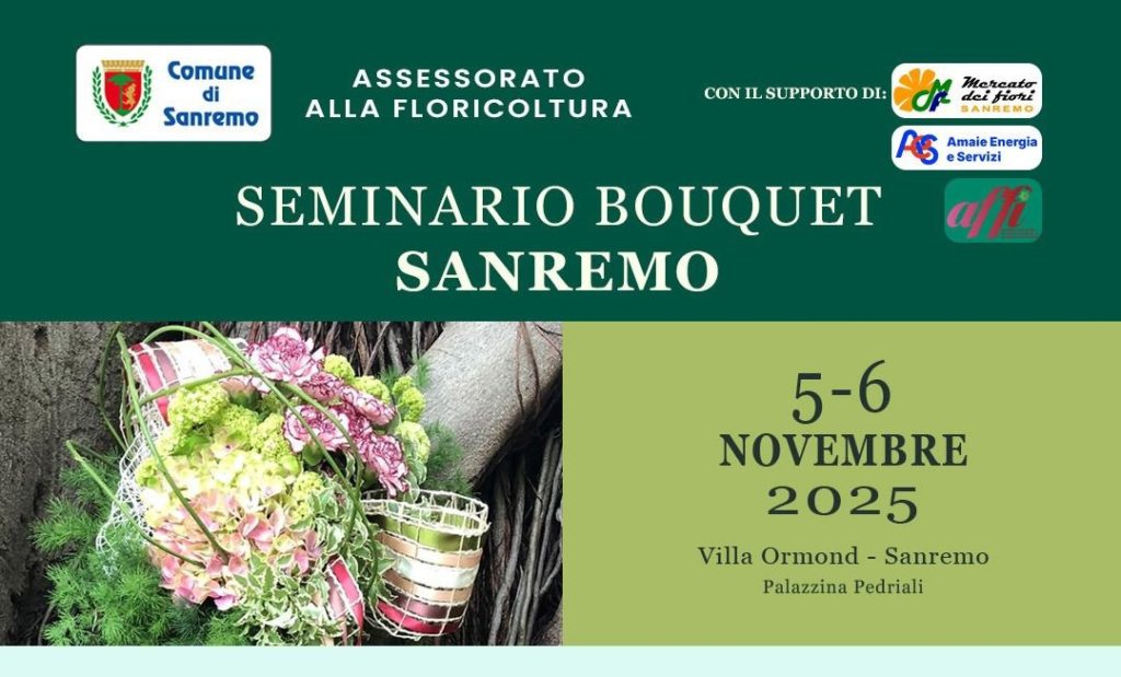 Appuntamento mercoledì 5 e giovedì 6 novembre a Villa Ormond con il “Seminario Bouquet Sanremo edizione 2025” a cui parteciperanno quattro grandi maestri di arte floreale italiana: Maria Cecilia Serafino, Alessandro Musco, Antonio Trentini e Vincenzo Frascella.