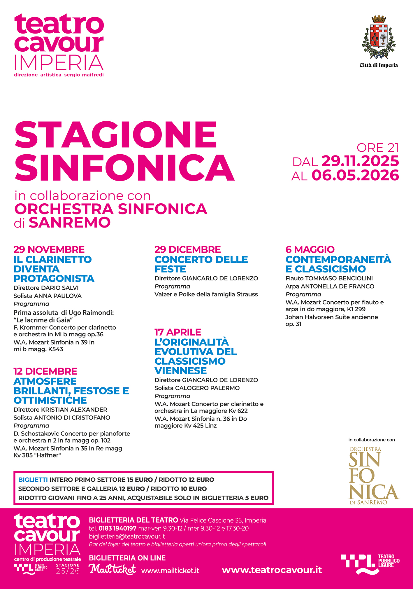 Al Teatro Cavour di Imperia arriva la musica classica, importante filone che entra con il respiro delle grandi sinfonie nella Stagione 25/26 diretta da Sergio Maifredi. La Stagione Sinfonica, realizzata in collaborazione con l’Orchestra Sinfonica di Sanremo, inizia sabato 29 novembre 2025 alle ore 21 con “Il clarinetto diventa protagonista”. Il concerto si inaugura con una prima esecuzione assoluta, “Le lacrime di Gaia”, nuova composizione del pianista e compositore Ugo Raimondi. A seguire, il programma accompagna il pubblico nel cuore del classicismo con la luminosa eleganza del Concerto per clarinetto op. 36 di Franz Krommer, interpretato da una solista d’eccezione, Anna Paulova, già vincitrice di numerosi concorsi internazionali, tra cui il primo premio al Manhattan International Musica Competition. Questo capolavoro di virtuosismo e cantabilità esalta tutte le sfumature dello strumento solista: dal lirismo intenso dell’Adagio alla brillantezza gioiosa del Rondò conclusivo. La serata prosegue con una delle vette assolute della produzione mozartiana: la Sinfonia n. 39 K 543, pagina maestosa e sorprendentemente fresca. Dalla solenne introduzione iniziale al finale travolgente, l’opera avvolge l’ascoltatore in un crescendo di energia, grazia e perfezione formale. A dirigere l’Orchestra Sinfonica di Sanremo sarà il M° Dario Salvi,direttore d’orchestra, musicologo e ricercatore italo-scozzese. Un appuntamento dedicato agli amanti della grande musica.